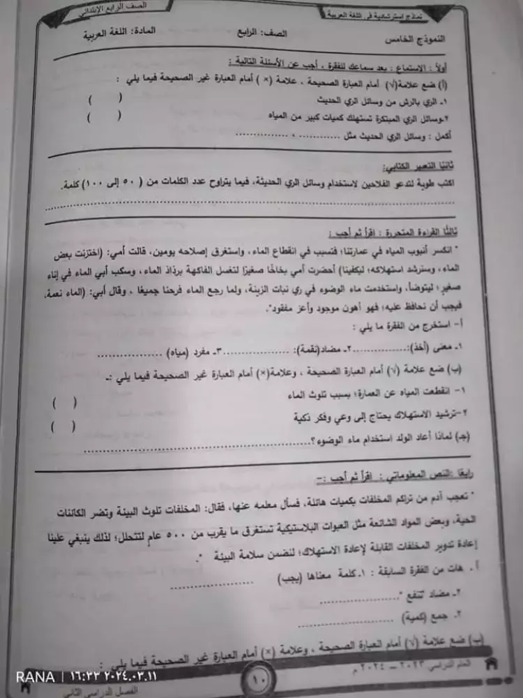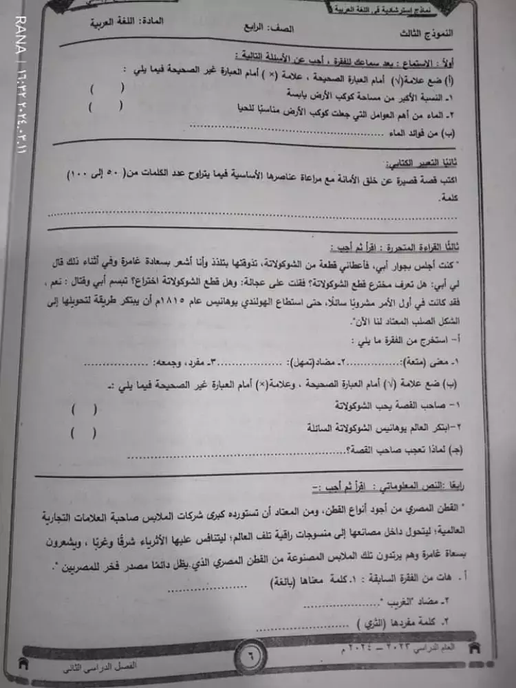 نماذج امتحانات لغة عربية للصف الرابع الابتدائي الترم الثاني 2024