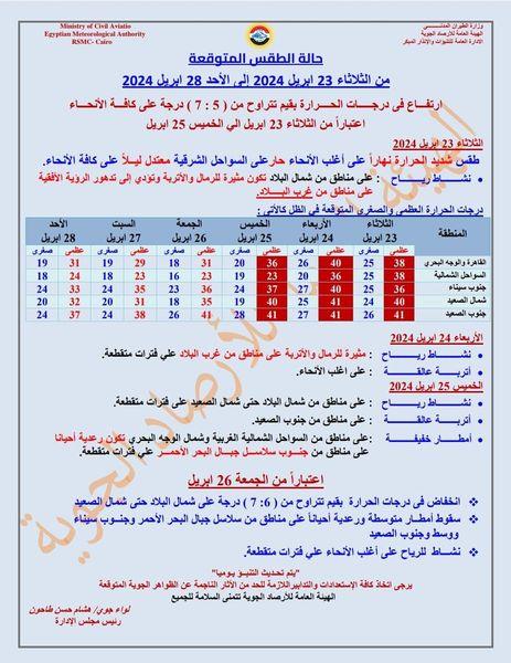 وكشفت هيئة الأرصاد أيضًا عن حالة الطقس غدًا الأربعاء الموافق 24 أبريل 2024، مشيرة إلى أن ذروة ارتفاع درجات الحرارة والموجة الحارة ستكون غدًا، حيث تصل العظمى على القاهرة 40 درجة مئوية.