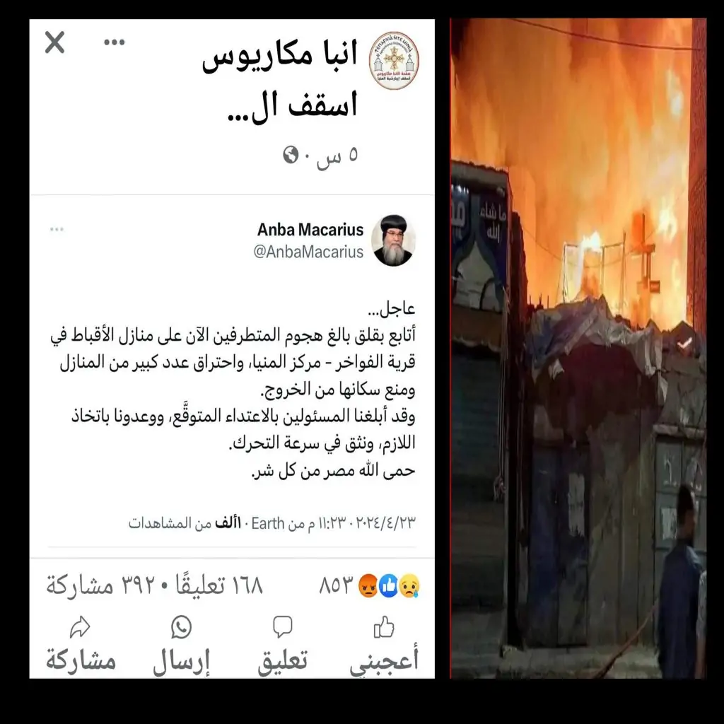 ينشر موقع «الرئيس نيوز» تفاصيل القصة التي بدأت بكتابة الأنباء مكاريوس على صفحته، مساء أمس، «عاجل»: “بشأن هجوم قرية الفواخر بالمنيا فإني أتابع بقلق بالغ هجوم المتطرفين الآن على منازل الأقباط في قرية الفواخر بمركز المنيا، الذي تسبب في احتراق عدد كبير من المنازل ومنع السكان من الخروج”، مضيفًا أنه قد أبلغ المسؤولين بالاعتداء الذي حدث، مطالبًا في الوقت ذاته بضرورة اتخاذ اللازم، وأنهم على ثق في سرعة التحرك، حمى الله مصر من كل شر.