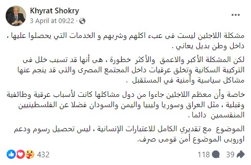 وأضاف اللواء خيرت عبر صفحته الرسمية على موقع التواصل الاجتماعي فيس بوك، أن معظم اللاجئين جاءوا من دول مشاكلها كانت لأسباب عرقية وطائفية وقبلية، مثل العراق وسوريا وليبيا واليمن والسودان، متابعًا: “الموضوع مع تقديري الكامل للاعتبارات الإنسانية يندرج تحت الأمن القومي الصرف”.