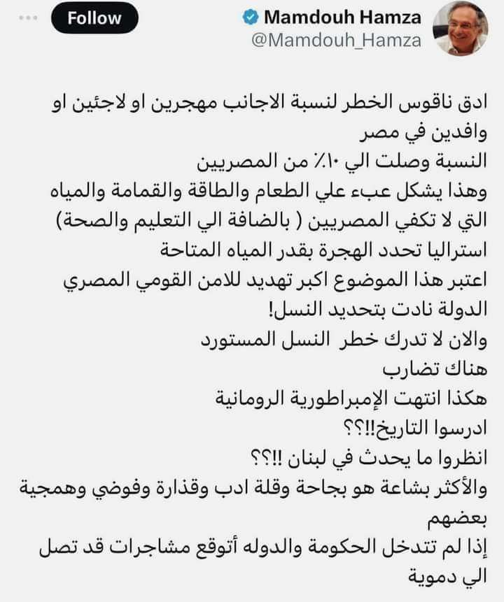 اللواء عبد الحميد خيرت، يرى أن مشكلة اللاجئين ليست في العبء الاقتصادي وحده، لكن المشكلة الأكبر والأعمق والأكثر خطورة بحسب رأيه، هي ما تتسبب فيه هذه الأعداد خلل في التركيبة السكانية، وتخلق عرقيات داخل المجتمع المصري، والتي قد ينجم عنها مشكلات سياسية وأمنية مستقبلًا.