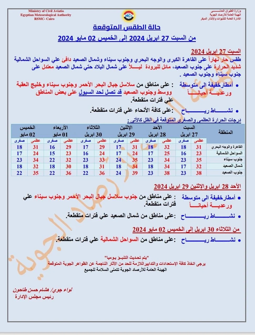 وأضافت الأرصاد الجوية في بيانها، اليوم الجمعة، أنه يستمر التوقع بطقس حار نهارًا على القاهرة الكبرى والوجه البحري وجنوب سيناء وشمال الصعيد دافئ على السواحل الشمالية شديدة الحرارة على جنوب الصعيد، مائل للبرودة ليلًا على شمال البلاد حتى شمال الصعيد معتدل على جنوب سيناء وجنوب الصعيد.