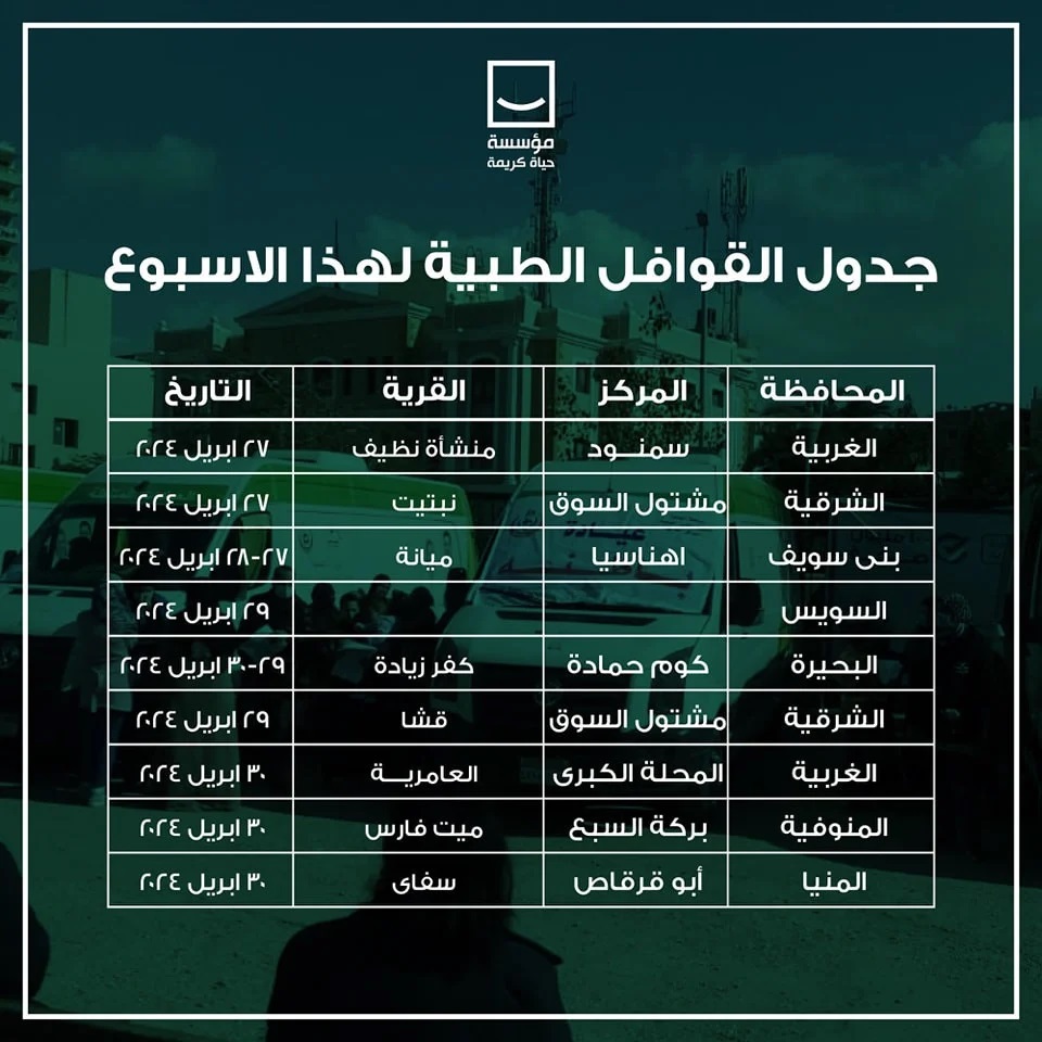 كشفت مؤسسة حياة كريمة، عن أماكن ومواعيد القوافل الطبية بالمحافظات خلال الأسبوع المقبل.