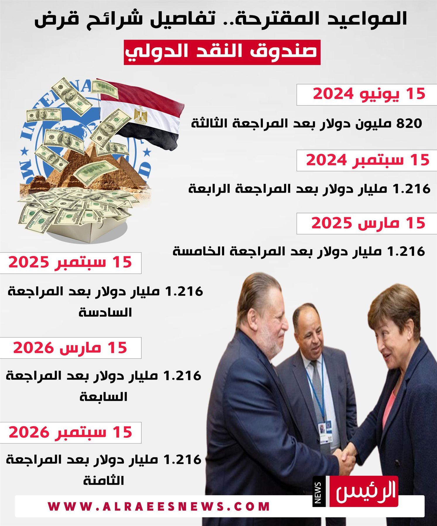 ووفقا للتقرير، “الرئيس نيوز” يستعرض المواعيد المقترحة للمراجعات وصرف صندوق النقد الدولي شرائح القرض لمصر المقبلة وهي كالآتي: