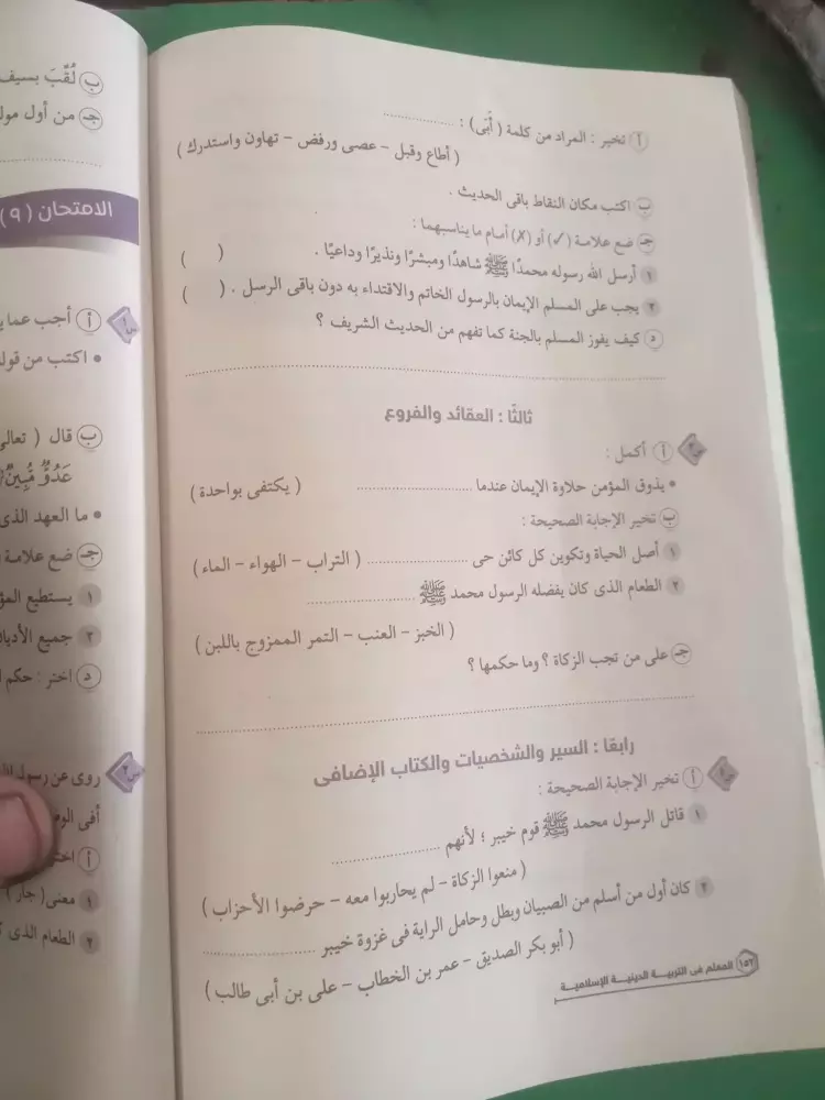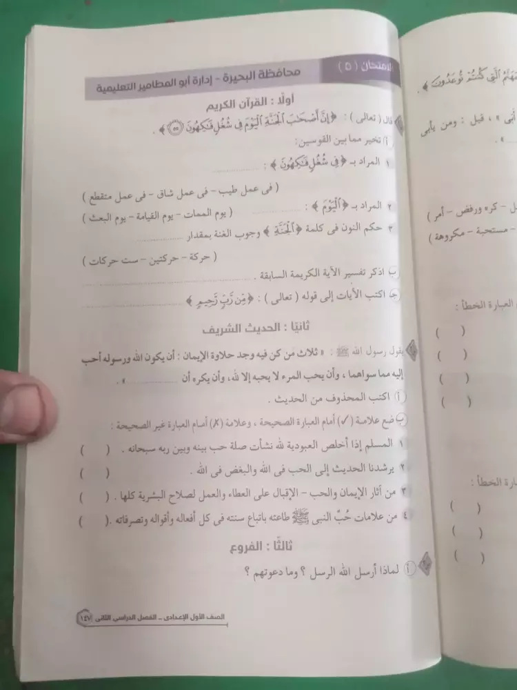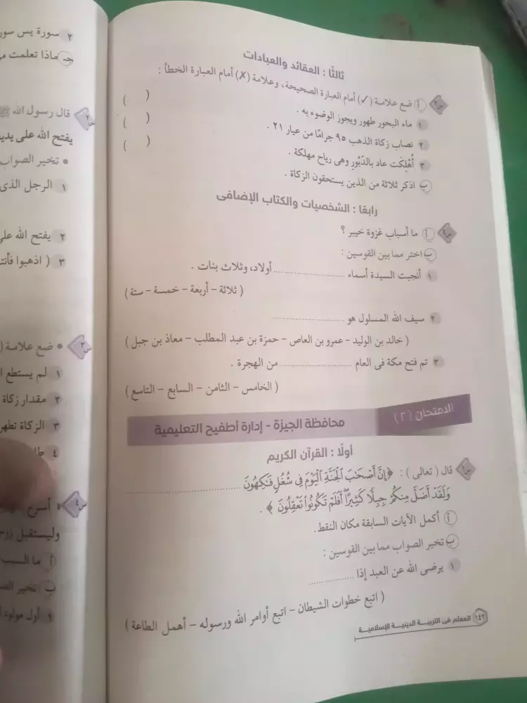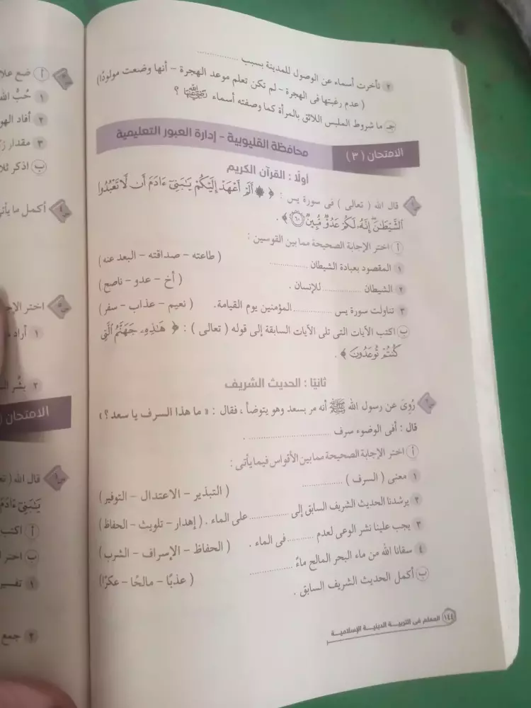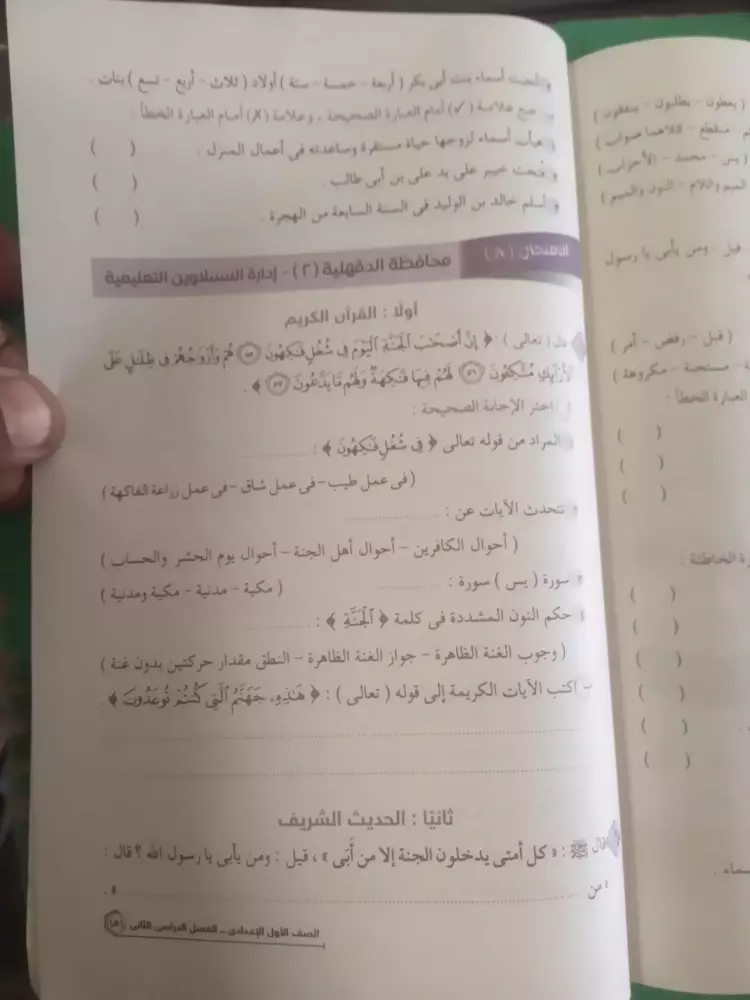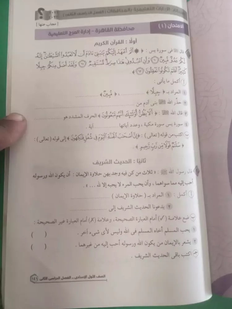 يشار إلى أنه قد تستخدم نماذج الامتحانات كمراجعة ليلة الامتحان في مادة الدين لطلاب الصف الأول الإعدادي الفصل الدراسي الثاني.