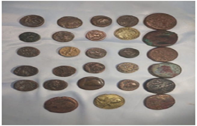 - عدد من العملات المعدنية مختلفة الأشكال والأحجام تعود لعصور قديمة.