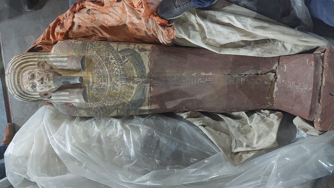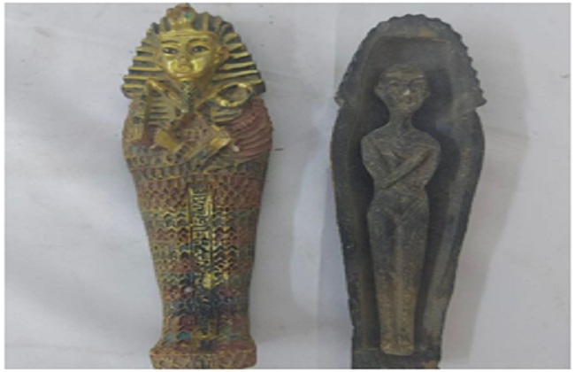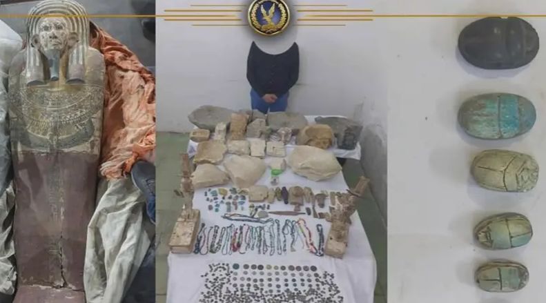 وعثرت السلطات داخل المنزل، على تمثالين خشبيين عليهما نقوش ورسومات وعدد من اللوحات الحجرية ولفائف البردي والجعران والقلادات مختلفة الأحجام والأشكال، كما عثر على عدد من التماثيل وأجزاء تماثيل غير مكتملة متنوعة تعود لعصور قديمة.