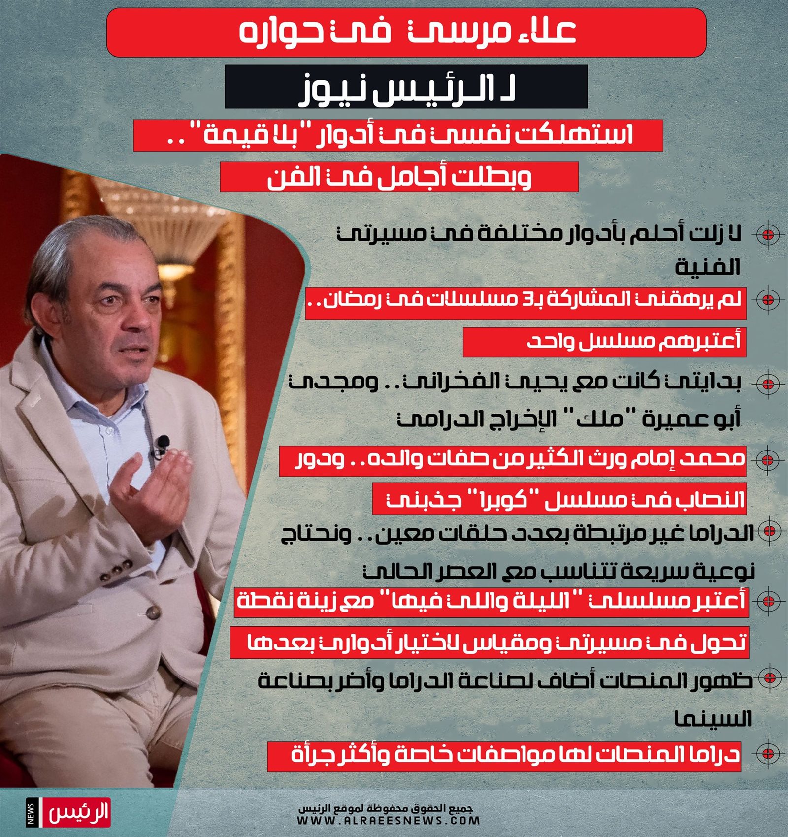 تحدث "الرئيس نيوز" مع الفنان القدير علاء مرسي، حول الأدوار التي قدمها وردود فعل الجمهور، بالإضافة للحديث عن حياته الشخصية وعلاقته بالوسط الفني، وتفاصيل أخرى كثيرة.