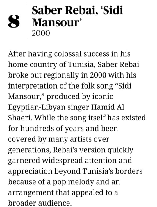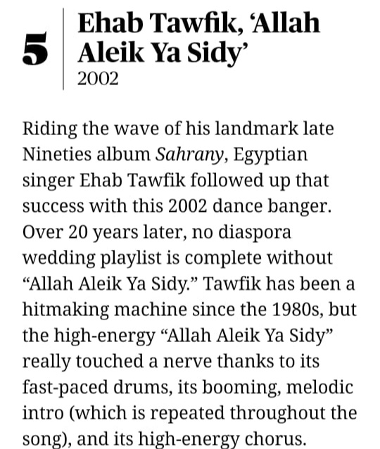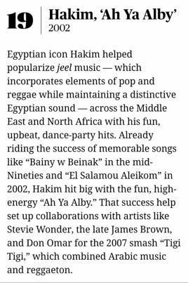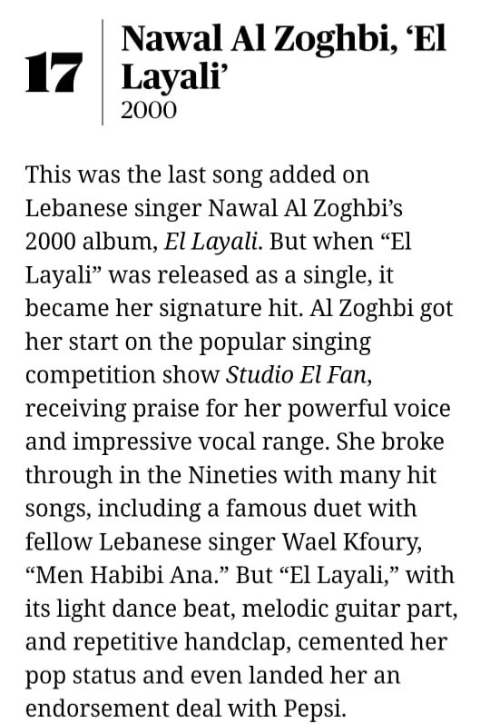 أعلنت مجلة "rolling ston" الأمريكية العالمية عن أفضل 50 أغنية عربية في القرن الـ 21، وذلك وفق دراسات متخصصة في مجال الموسيقى، عبر استشارة لجنة من الأكاديميين والصحفيين الموسيقيين ومحترفي الصناعة والمؤرخين والفنانين، وأخذ الترتيب النهائي في الاعتبار جودة الأغنية وشعبيتها وتأثيرها الثقافي.