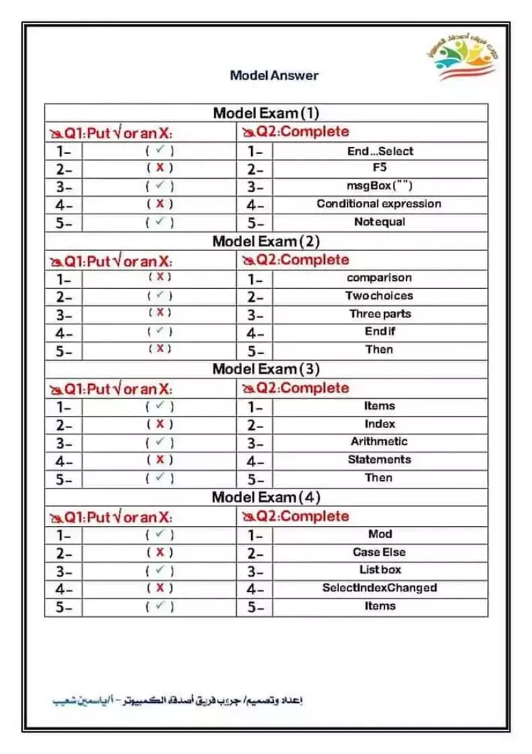 مرفق بالأسفل نماذج الامتحانات مع إجاباتها النموذجية، ومثال الأسئلة الواردة فيها ما يلي: