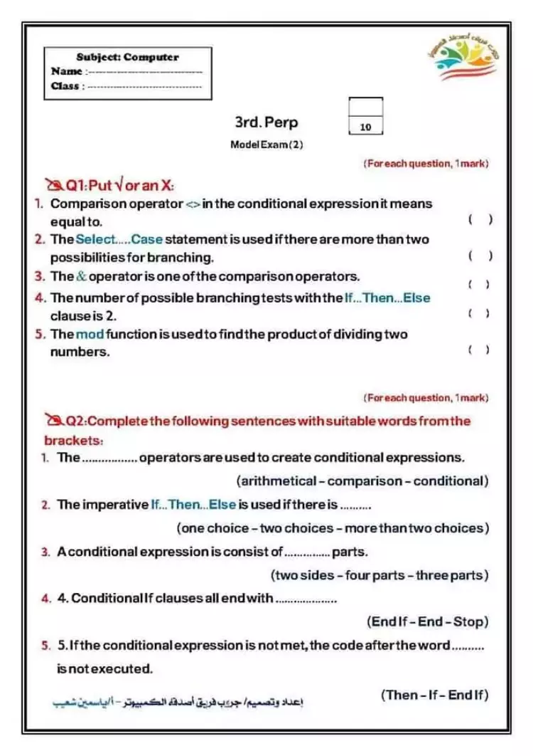 نماذج امتحانات كمبيوتر للصف الثالث الإعدادي لغات ترم ثاني 2024