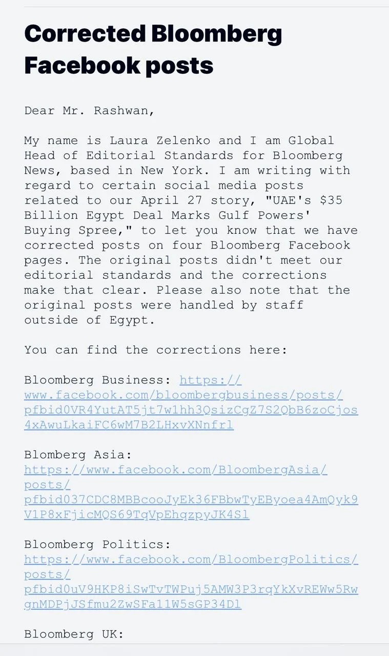 اسمي "لورا زيلينكو" أنا الرئيس الدولي للمعايير التحريرية في أخبار بلومبرج، في نيويورك. أكتب إليك بخصوص بعض المنشورات على وسائل التواصل الاجتماعي المتعلقة بتقريرنا في 27 أبريل، بعنوان "صفقة الإمارات بقيمة 35 مليار دولار لمصر تُمثل نزوع القوى الخليجية للشراء"، لأعلمك بأننا قمنا بتصحيح المنشورات على أربع صفحات لبلومبرج على "فيسبوك"، المنشورات الأصلية لم تلبي معاييرنا التحريرية والتصحيحات توضح ذلك. يُرجى ملاحظة أيضًا أن المنشورات الأصلية تمت بواسطة عاملين خارج مصر".