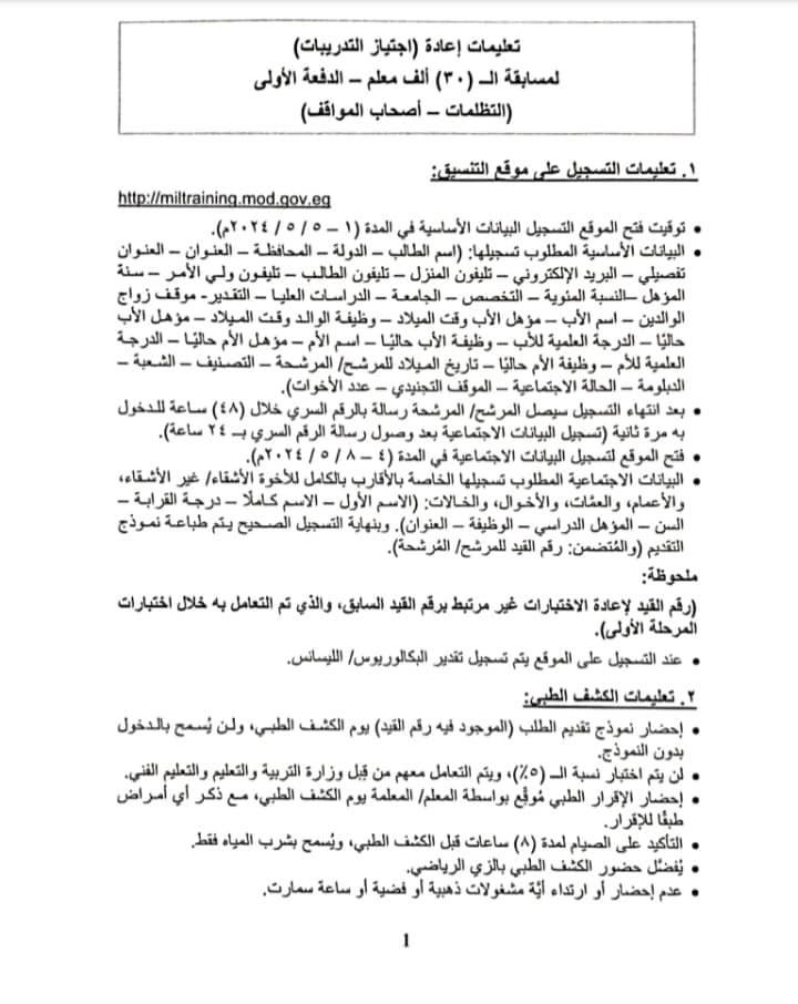 وتنوه وزارة التربية والتعليم إلى ضرورة قيام المعلمين والمعلمات الذي تقدموا بالتظلمات بالتسجيل من خلال الموقع التالي: http://miltraining.mod.gov.eg