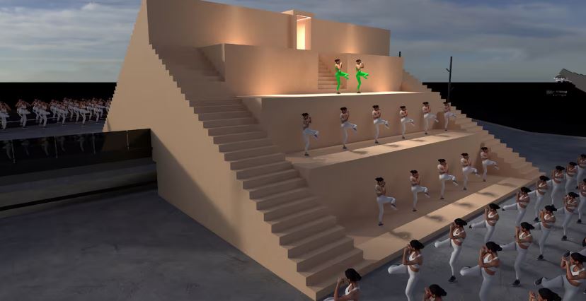 وذكرت صحيفة نيوز توك أن 100 مدرب سيقومون بصعود السلالم بسرعة وسيتم وضعهم في كل مستوى من مستويات المسرح لإرشاد حوالي 200 متدرب يتبعونهم على جانبي المسرح العملاق، وبدأ استغلال الموقف كمسرح بطابع معماري مصري خلال فترة كوفيد وأثبت نجاحه، ويتيح المسرح التمرينات لعدد كبير من المتدربين يتدربون معًا في تنسيقات متباعدة بشكل خاص بينما كان الكثيرون في بلدان أخرى "محصورين في داخل غرفة".