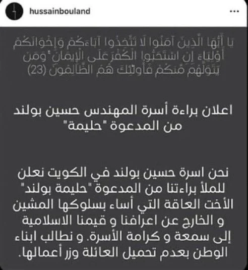 أصدرت أسرة الإعلامية حليمة بولند، بيانا من أحد أفرادها (المهندس حسين بولند) تم الاعلان فيه عن تبرأ عائلتها منها، بعد القضية التي حكم عليها فيها بالحبس لاتهامها بالتحريض على الفسق والفجور وفيما يلي نص البيان: « براءة أسرة المهندس حسين بولند من المدعوة "حليمة".. نحن اسرة حسين بولند في الكويت نعلن للملأ براءتنا من المدعوة "حليمة بولند" الأخت العاقة التي أساءت بسلوكها المشين والخارج عن أعرافنا وقيمنا الإسلامية إلى سمعة وكرامة الأسرة ونطالب أبناء الوطن بعدم تحميل العائلة وزر أعمالها».