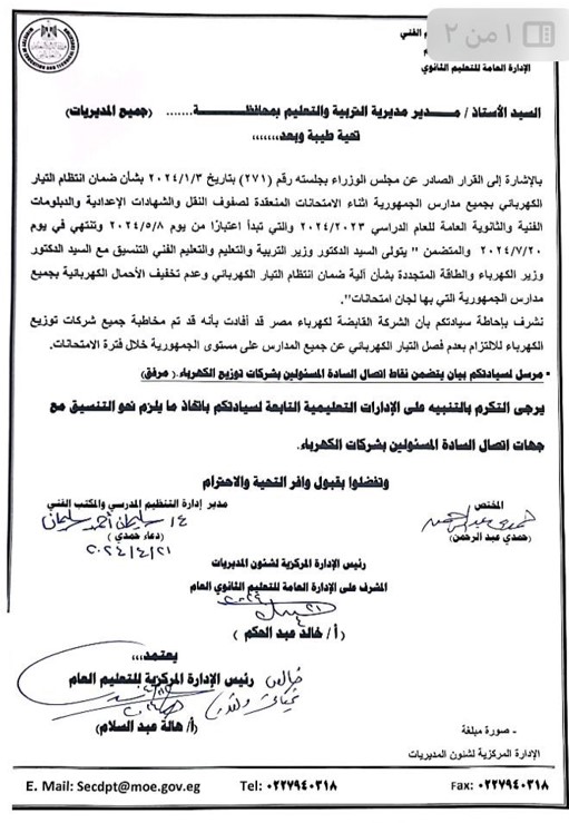 اتفقت وزارة التربية والتعليم، مع ووزارة الكهرباء، على عدم فصل التيار الكهربائي عن جميع المدارس على مستوى الجمهورية، خلال فترة الامتحانات، وتشمل امتحانات النقل والدبلومات الفنية، وكذلك امتحانات إتمام الثانوية العامة.