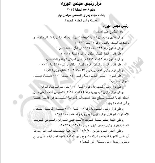 كما جرى الاطلاع على قرار رئيس الجمهورية رقم 55 لسنة 2024 بتخصيص قطعة أرض من أملاك الدولة الخاصة لصالح هيئة المجتمعات العمرانية لاستخدامها في إقامة مدينة رأس الحكمة الجديدة وعلى قرار رئيس الجمهورية رقم 151 لسنة 2024 باستبدال اللوحة وجدول الإحداثيات المرفقين بقرار رئيس الجمهورية رقم 55 لسنة 2024؛ وعلى لائحة تنظيم سياحة اليخوت الأجنبية في المراين والموانئ البحرية الصادرة بقرار رئيس مجلس الوزراء رقم 2721 لسنة 2022؛ وعلى الاتفاق المبرم بتاريخ 23-2-2024 بين هيئة المجتمعات العمرانية وشركة أبو ظبي التنموية القابضة وشركة مشروع رأس الحكمة للتنمية العمرانية بشأن بيع وتطوير وتنمية أرض بمنطقة رأس الحكمة.