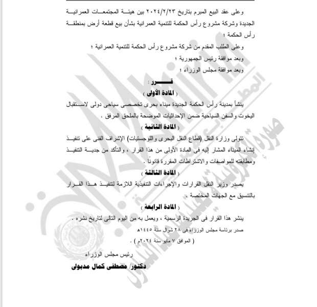 وأيضًا بعد الاطلاع على عقد البيع المبرم بتاريخ 23-2-2024 بين هيئة المجتمعات العمرانية الجديدة وشركة مشروع رأس الحكمة للتنمية العمرانية بشأن بيع قطعة أرض بمنطقة رأس الحكمة، وعلى الطلب المقدم من شركة مشروع رأس الحكمة للتنمية العمرانية.