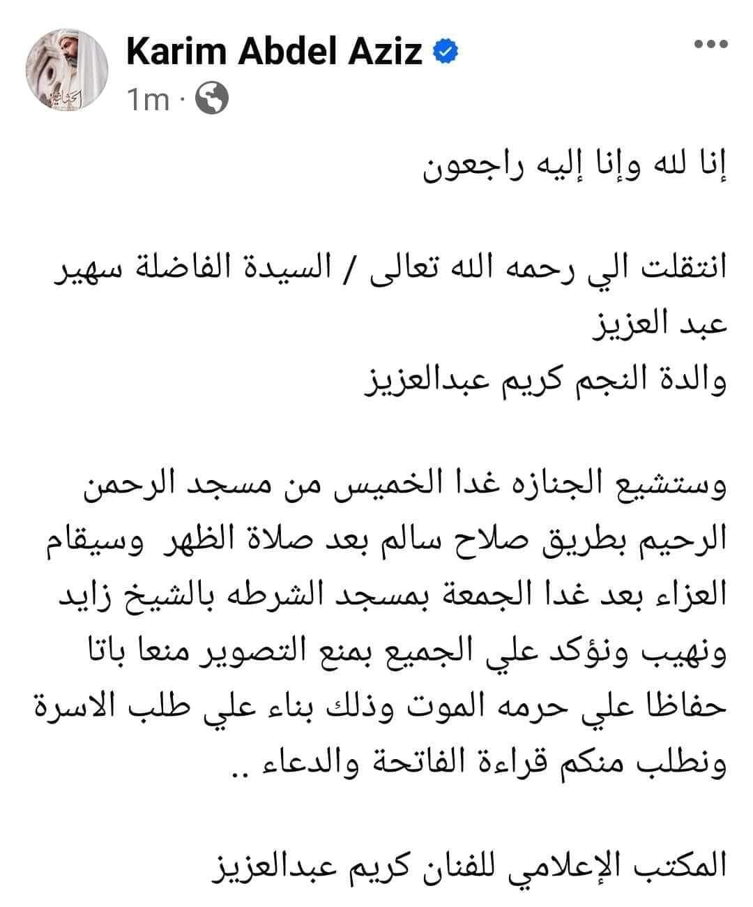 أعلن الفنان كريم عبد العزيز، منع التصوير في جنازة وعزاء والدته السيدة سهير عبدالعزيز، التي وافتها المنية منذ قليل.