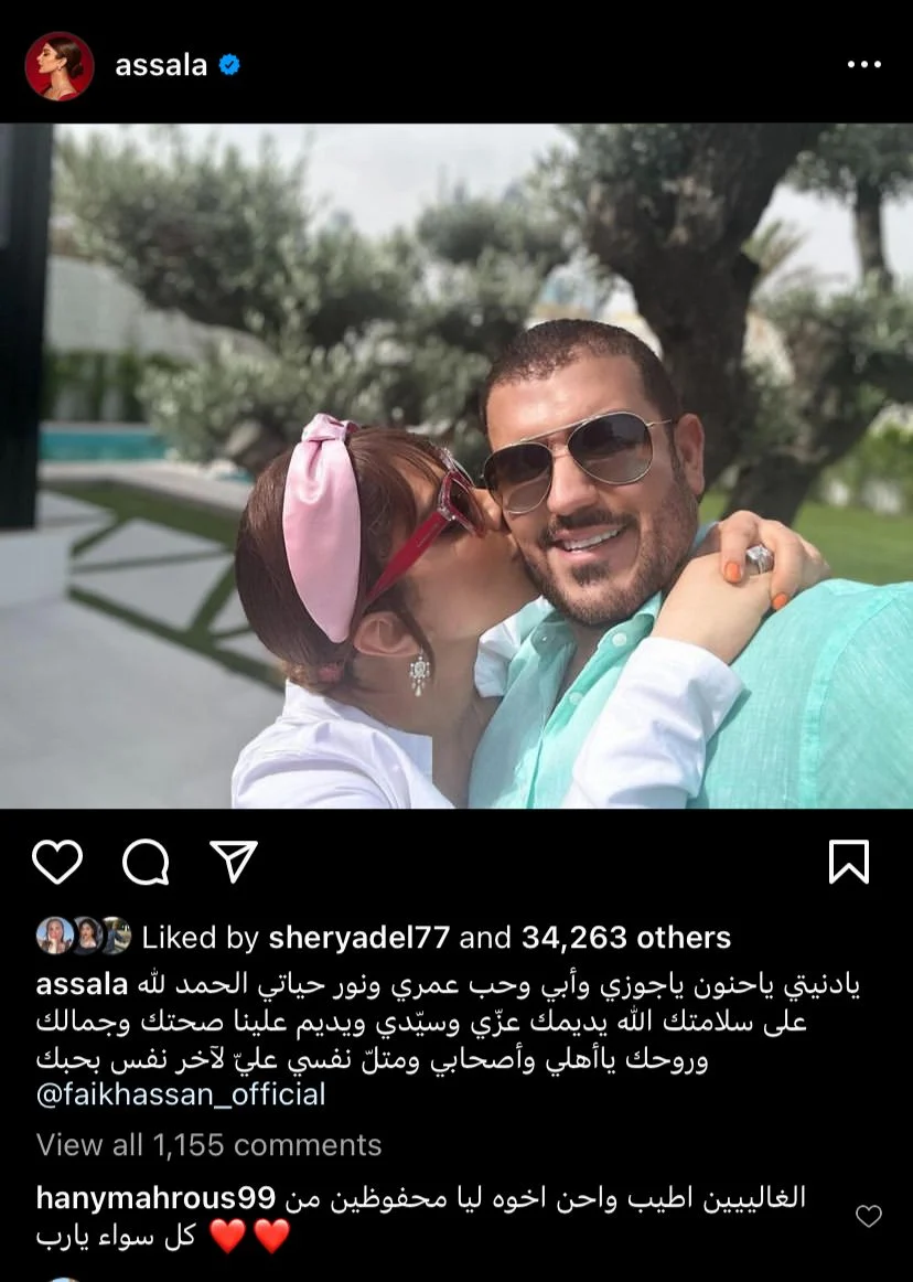 ردت أصالة على شائعة طلاقها بنشر صورة جديدة مع زوجها عبر حسابها بتطبيق Instagram، تظهر فيها وهي تقبل فائق حسن، وعلقت عليها كاتبة: "يادنيتي ياحنون ياجوزي وأبي وحب عمري ونور حياتي الحمد لله على سلامتك الله يديمك عزّي وسيّدي ويديم علينا صحتك وجمالك وروحك ياأهلي وأصحابي ومتلّ نفسي عليّ لآخر نفس بحبك".