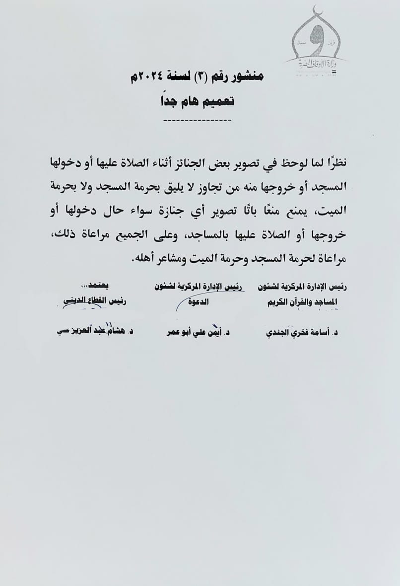 "تعميم هام جدًا.. نظرًا لما لوحظ في تصوير بعض الجنائز أثناء الصلاة عليها أو دخولها المسجد أو خروجها منه من تجاوز لا يليق بحرمة المسجد ولا بحرمة الميت، يمنع منعًا باتًا تصوير أي جنازة سواء حال دخولها أو خروجها أو الصلاة عليها بالمساجد، وعلى الجميع مراعاة ذلك، مراعاة لحرمة المسجد وحرمة الميت ومشاعر أهله".