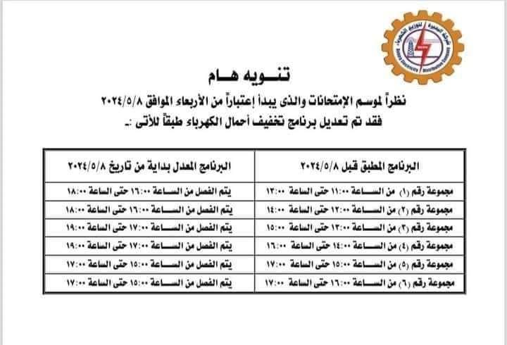 الشركة القابضة لكهرباء مصر أصدرت بيانًا مهمًا، أكدت فيها حرصا من الدولة على مصلحة الطلاب وانتظام سير العملية الامتحانية، وبناءً على التنسيق مع قطاع البترول، فقد تقرر تعديل خطة تخفيف الأحمال اليومية لتصبح من الساعة 3 مساء حتى الساعة 7 مساء موزعة على مستوى مناطق الجمهورية بحيث لا تزيد فترة الفصل لكل منطقة عن ساعتين، وجاء تغيير خطة تخفيف الأحمال بناءا على طلب من وزارة التربية والتعليم والتعليم الفني، خلال فترة عقد الامتحانات بالمدارس على مستوى الجمهورية، وذلك من تاريخ 8/5/2024 وحتى 20/7/2024.