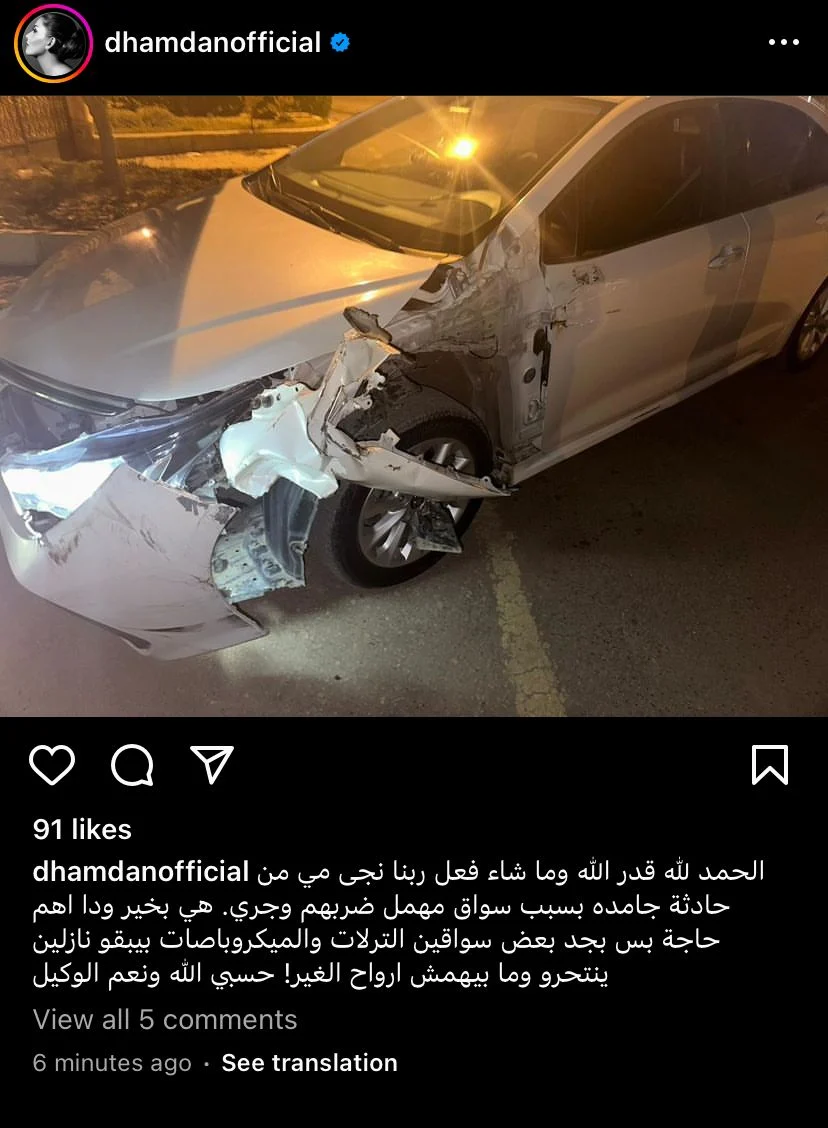نشرت ميس حمدان صورة لسيارة مي سليم وهي محطمة، معلقة عليها: "الحمد لله قدر الله وماشاء فعل، ربنا نجى مي من حادثة جامدة بسبب سواق مهمل، ضربهم وجرى، هي بخير ودا أهم حاجة، بس بعض سواقين التريلات والمكروباصات بيبقوا نازلين ينتحروا، ومبيهمش أرواح الغير، حسبي الله ونعم الوكيل ".
