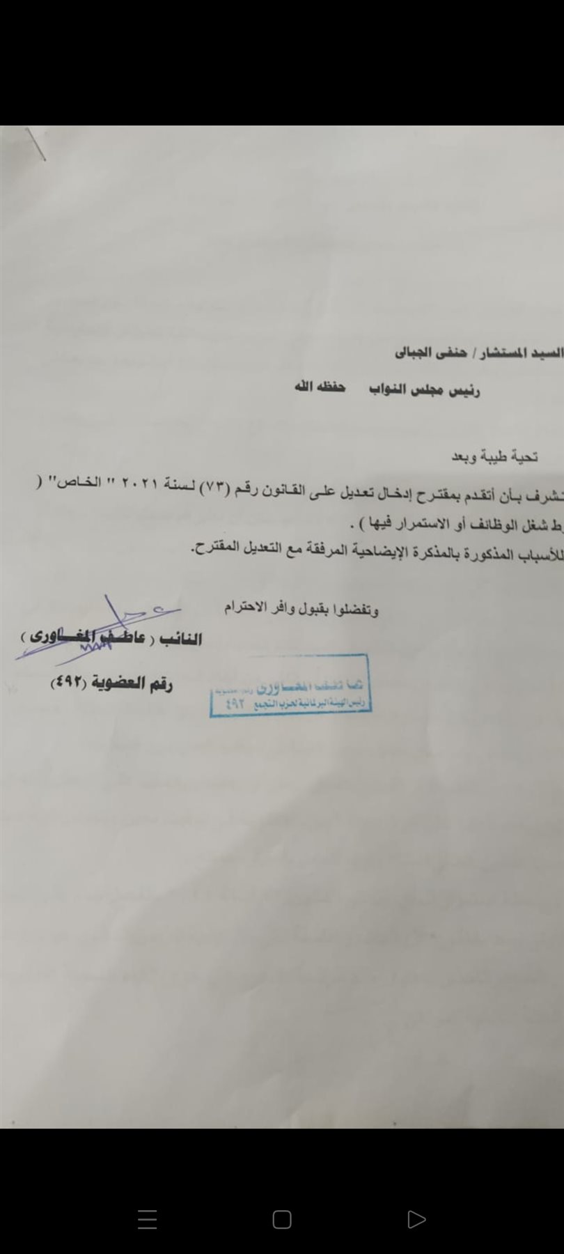 تقدم النائب عاطف المغاورى، رئيس الهيئة البرلمانية لحزب التجمع بمجلس النواب، بمشروع قانون بشأن تعديل بعض أحكام القانون رقم 73 لسنة 2021، بشأن شروط شغل الوظائف أو الاستمرار فيها، وهو الخاص بفصل الموظف المتعاطى للمخدرات، والذى أحاله رئيس المجلس المستشارحنفى جبالى إلى لجنة مشتركة من لجنتى القوى العاملة، والشئون الدستورية والتشريعية.