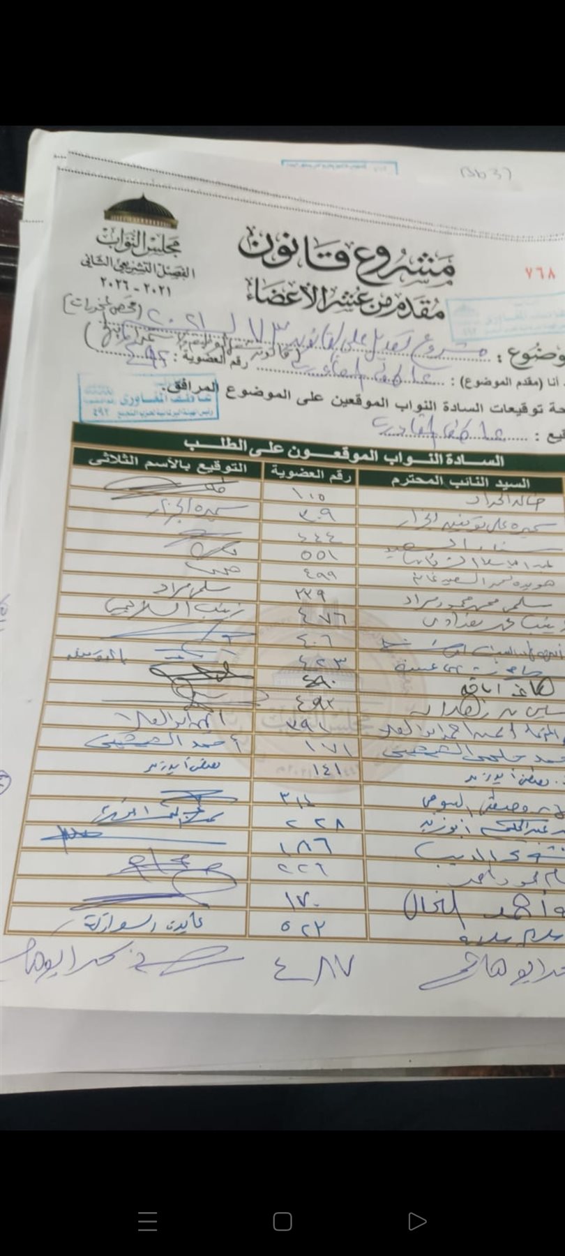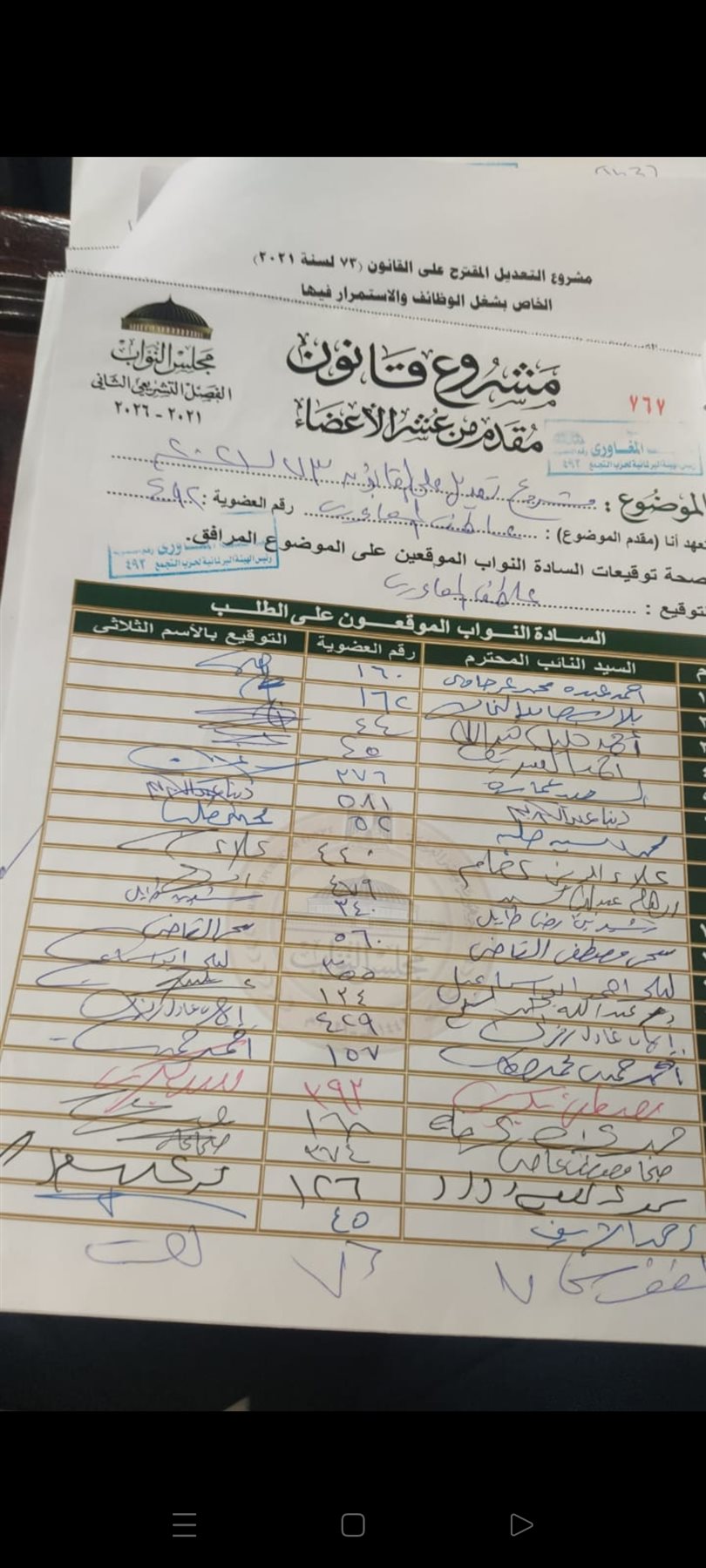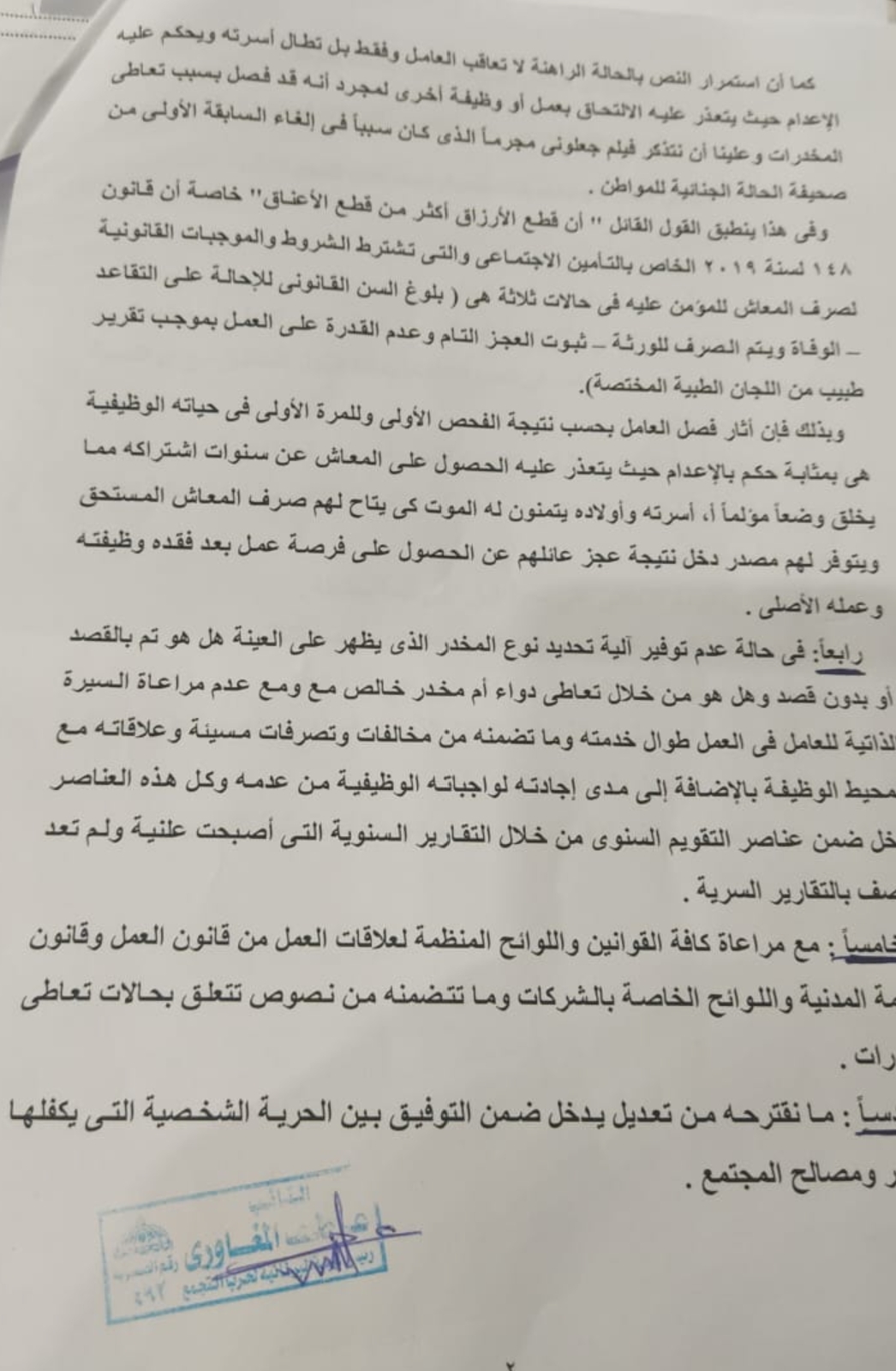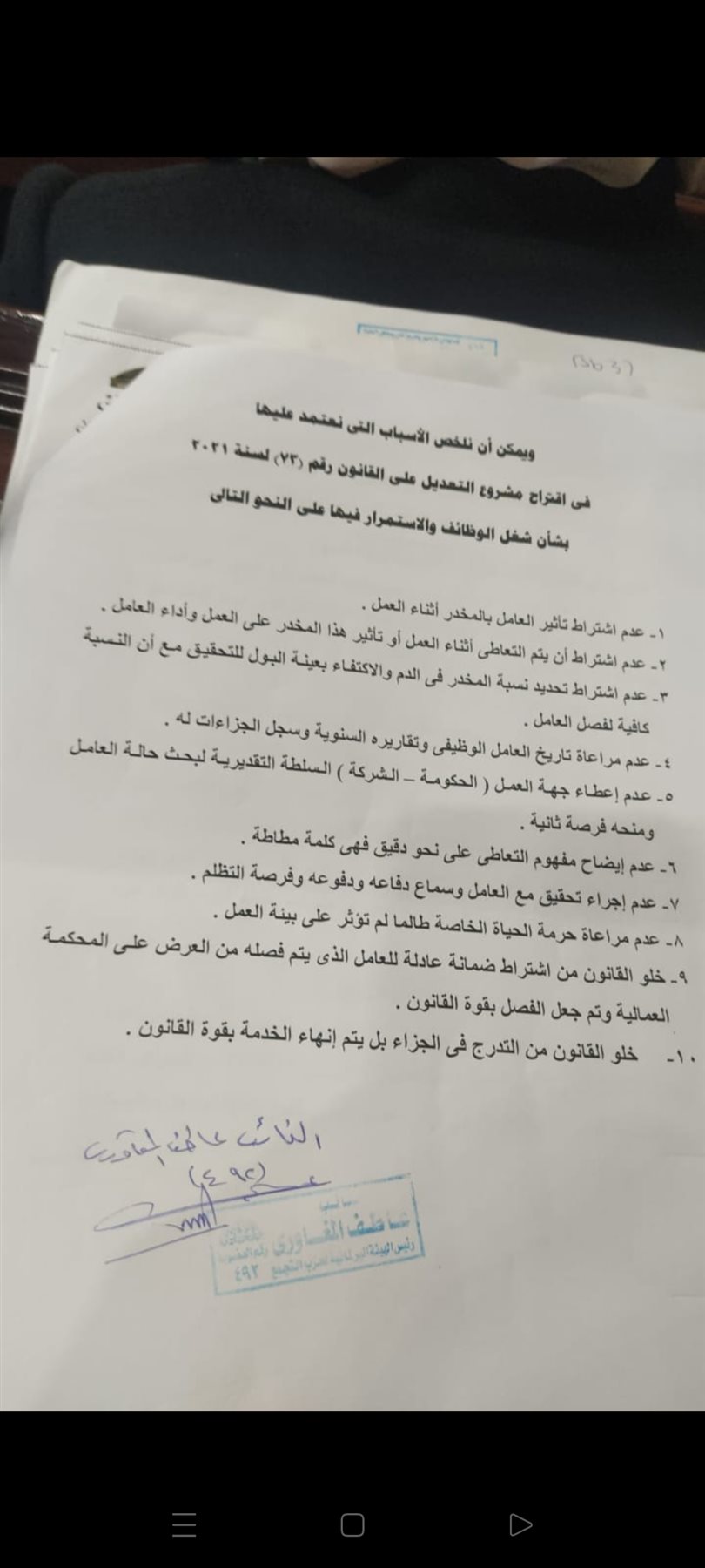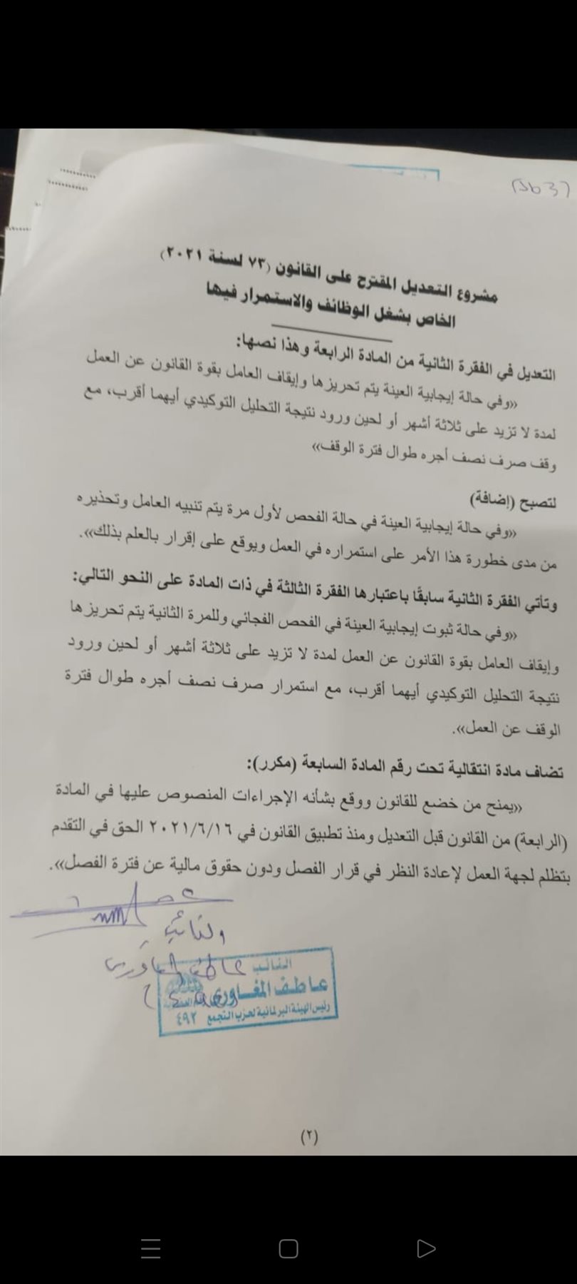 وجاء فى مقترح التعديل بالفقرة الثانية من المادة الرابعة: فى حالة إيجابية العينة يتم تحريزها وإيقاف العامل بقوة القانون عن العمل لمدة لا تزيد على ثلاثة أشهر أو لحين ورود نتيجة التحليل التوكيدى أيهما أقرب، مع وقف صرف نصف أجره طوال فترة الوقف.
