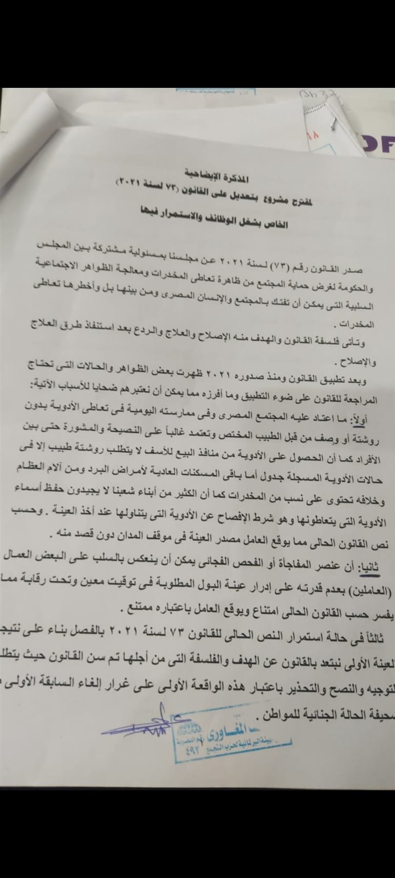 وحصل موقع "الرئيس نيوز"، على نسخة من المذكرة الإيضاحية لمشروع القانون، حيث يهدف مشروع القانون الى مواجهة الظواهر والحالات التى تحتاج إلى المراجعة، ومنها استبعاد الموظفين الذين يثبت عليهم تعاطى المخدرات، إلا أن التطبيق العملى أظهر أن هناك من اعتاد على تناول أدوية دون روشتة أو وصف من قبل الطبيب المختص وتعتمد غالبا على نصيحة والمشهود حتى بين الأفراد.