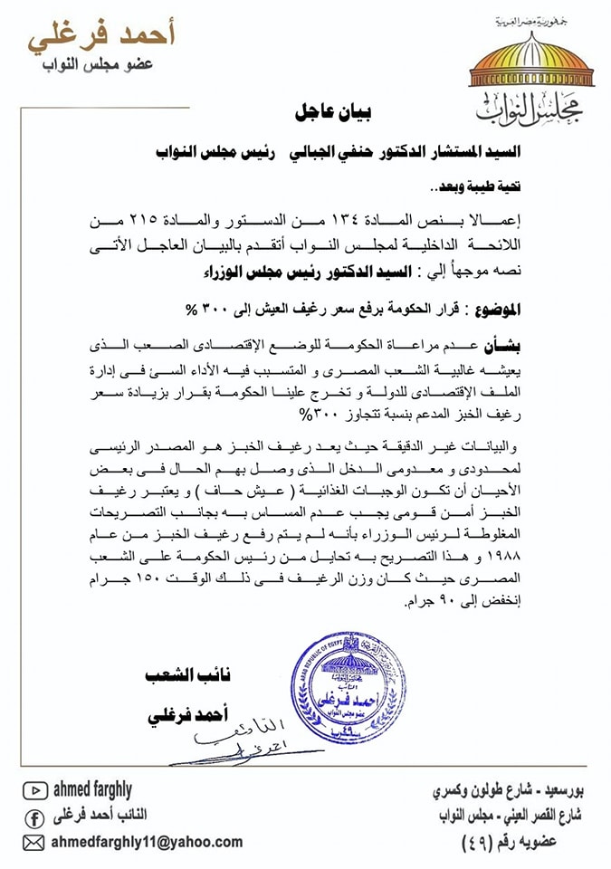تقدم أحمد فرغلي، عضو مجلس النواب، ببيان عاجل إلى المستشار الدكتور حنفي جبالي، رئيس المجلس، ضد الدكتور مصطفى مدبولي، رئيس الوزراء؛ بسبب رفع سعر رغيف الخبز المدعم لـ20 قرشًا.