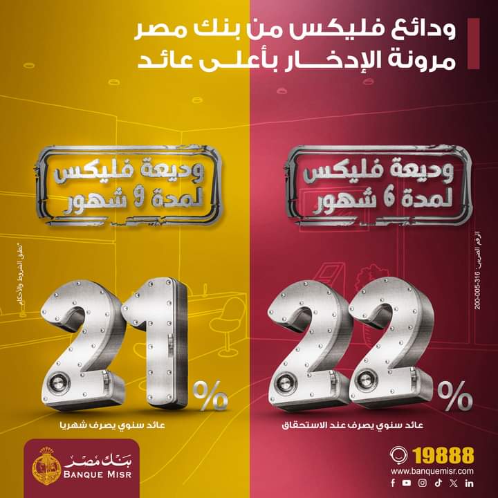 أعلن بنك مصر عن اصدار ودائع "فليكس" الادخارية بمدد استحقاق متنوعة على آجال 6 و9 أشهر، تحت معدل فائدة 21 و22% يصرف بنهاية المدة وبدورية صرف شهري ثابت.
