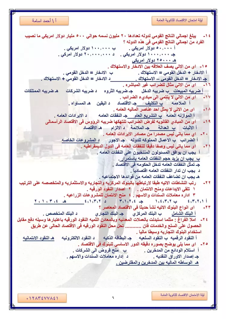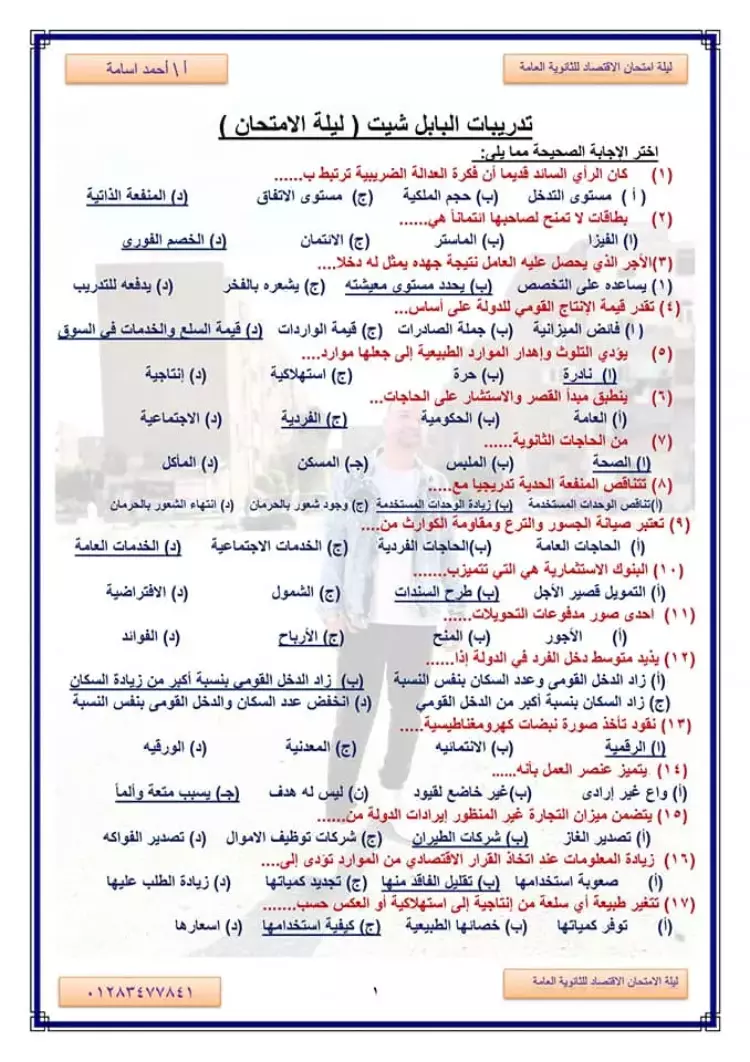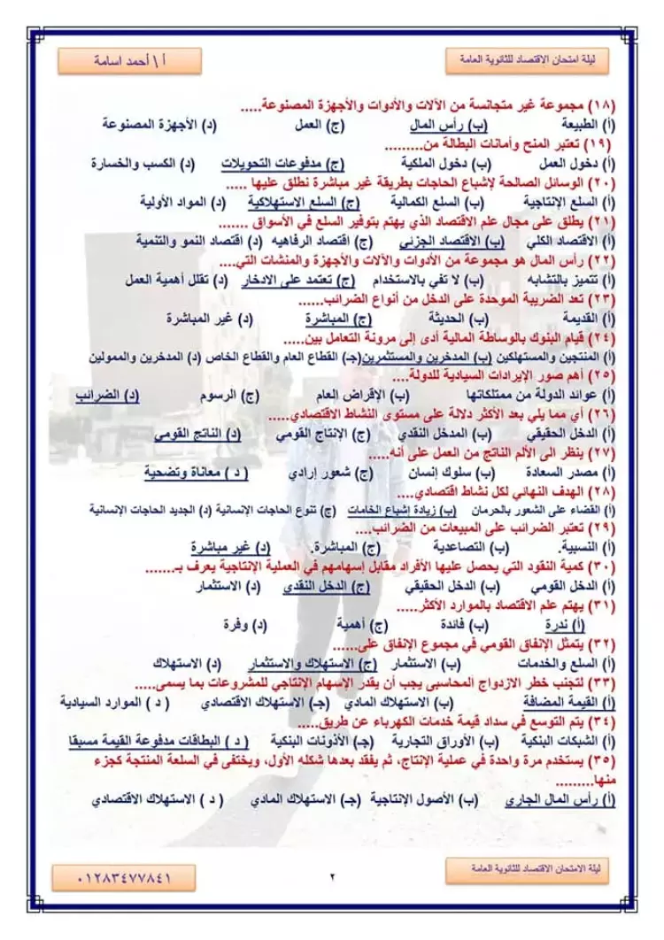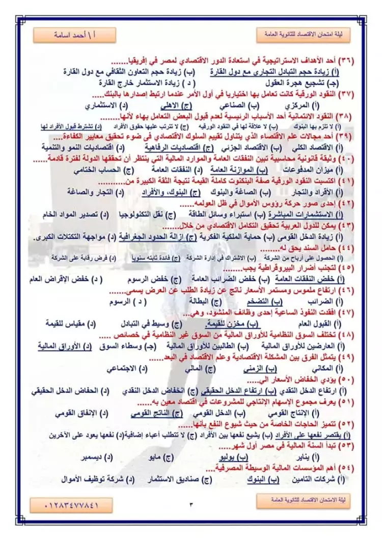 جاءت الأسئلة التالية ضمن مراجعة ليلة الامتحان اقتصاد للصف الثالث الثانوي: