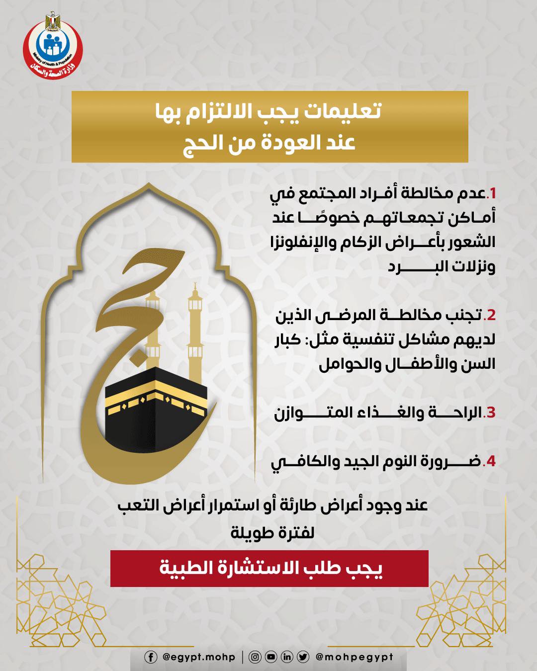 حرصت وزارة الصحة والسكان عبر صفحتها بـ "فيسبوك" على تقديم عدد من النصائح المهمة للحجاج عند العودة.