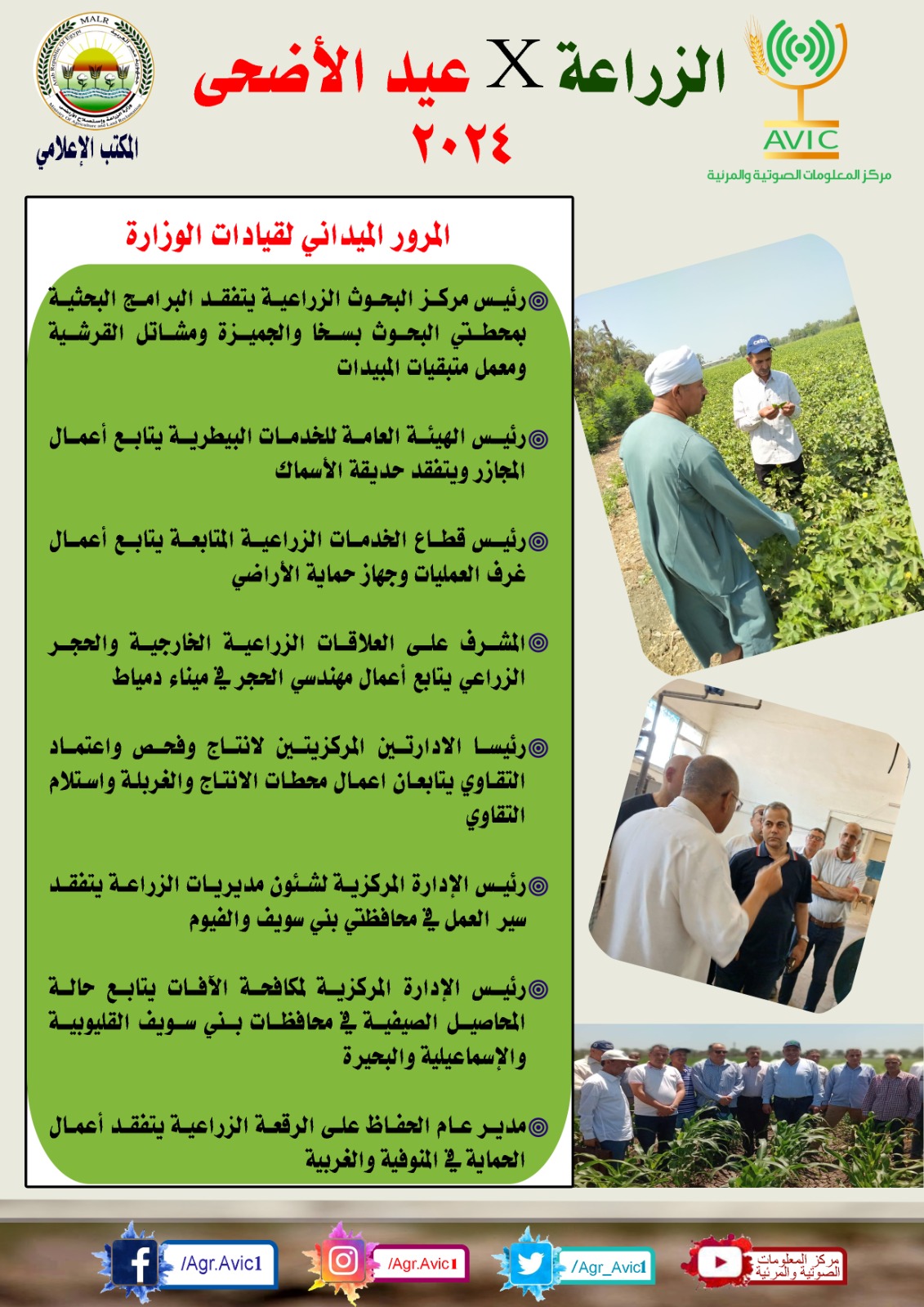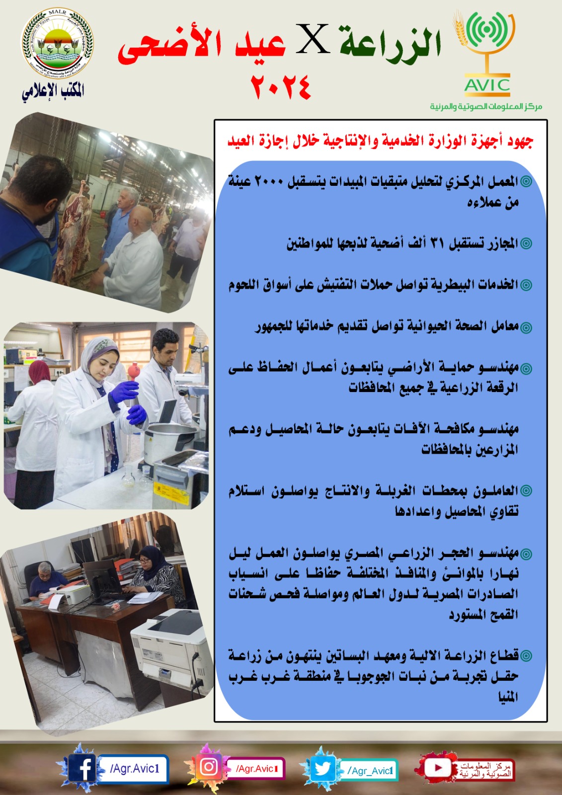 نشر مركز المعلومات الصوتية والمرئية بوزارة الزراعة واستصلاح الأراضي، إنفوجرافا وفيديو، استعرض خلاله أبرز أنشطة الوزارة وقطاعاتها المختلفة، خلال إجازة عيد الأضحى.