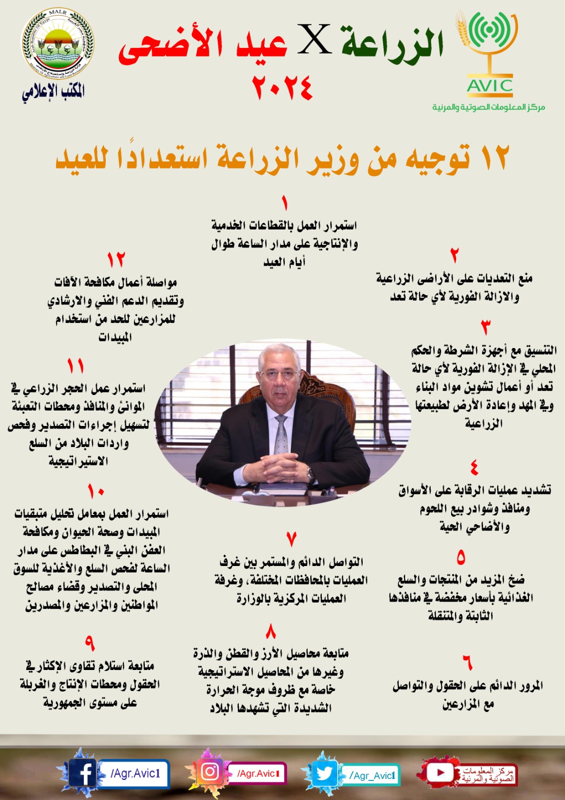 وأشار الإنفوجراف إلى أن هناك ١٢ توجيها من السيد القصير وزير الزراعة واستصلاح الأراضي، لقيادات الوزارة وقطاعاتها استعدادًا للعيد.