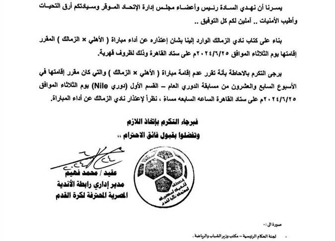 أرسلت رابطة الأندية المحترفة، خطابًا رسميًا، إلى الاتحاد المصري لكرة القدم، بشأن مباراة الأهلي والزمالك، المقرر لها غدًا الثلاثاء، في الدوري المصري الممتاز.
