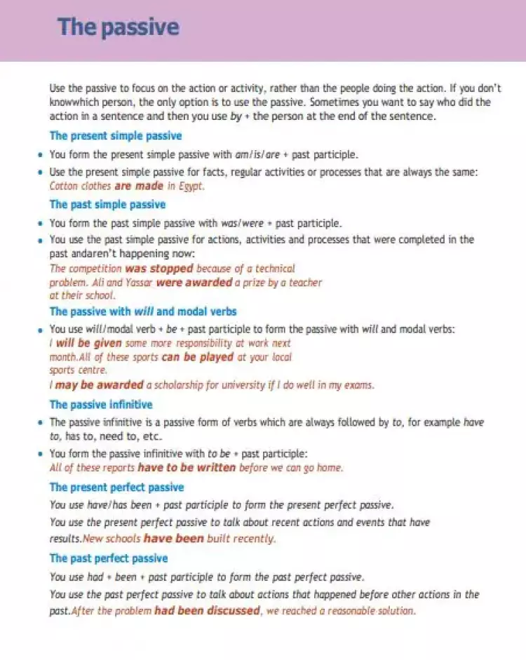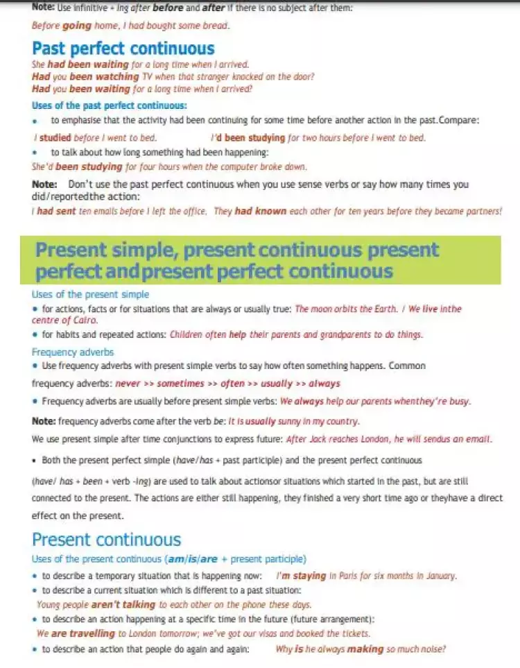 وفي الشرح استخدامات كل زمن مع أمثلة على كل استخدام، فمثلا تناول الكتيب الماضي البسيط على النحو التالي: