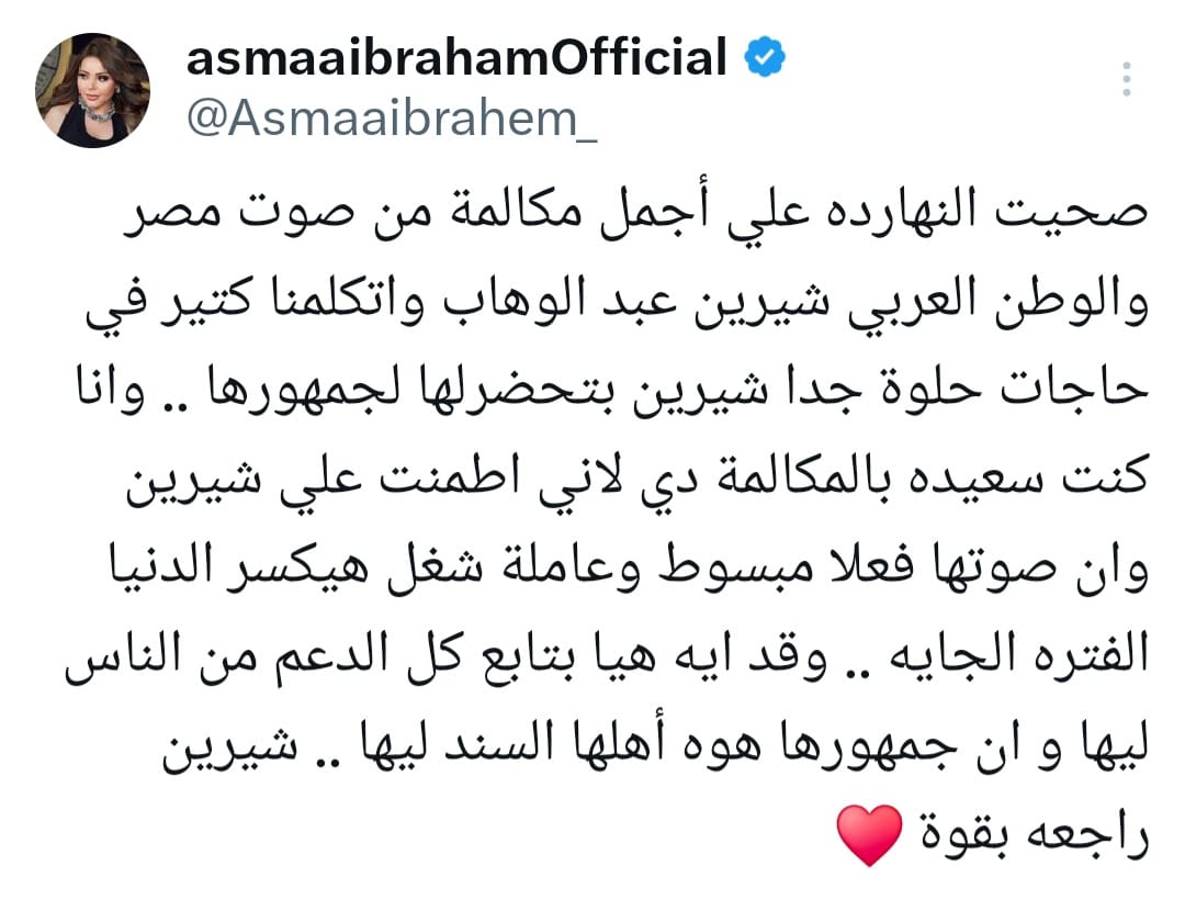 "صحيت النهارده علي أجمل مكالمة من صوت مصر والوطن العربي شيرين عبد الوهاب واتكلمنا كتير في حاجات حلوة جدا شيرين بتحضرلها لجمهورها "