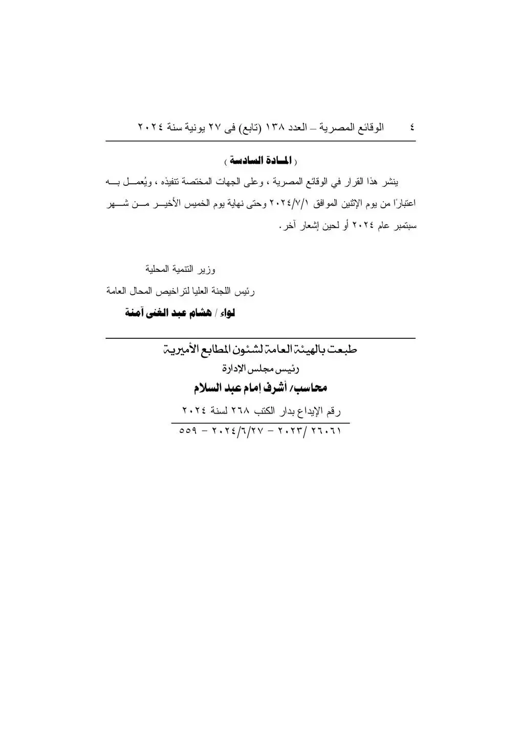 ونص القرار على أن ينشر هذا القرار في الوقائع المصرية، وعلى الجهات المختصة تنفيذه، ويعمل به اعتبارا من يوم الإثنين الموافق ٢٠٢٤/٧/١ وحتى نهاية يوم الخميس الأخير من شهر سبتمبر عام ٢٠٢٤ أو لحين إشعار آخر.