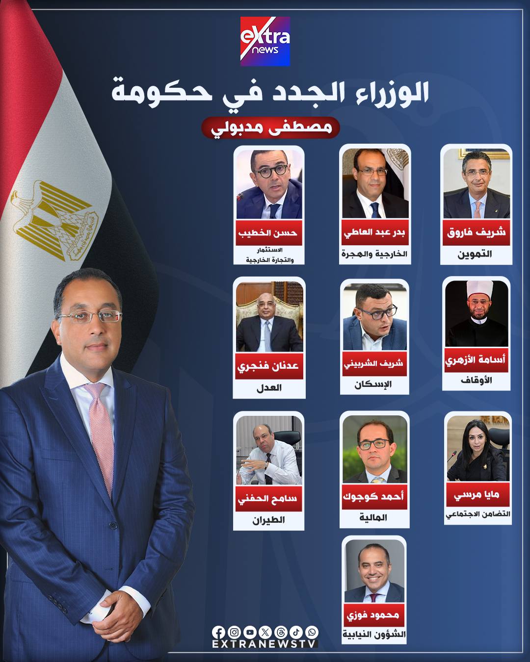 أعلنت قناة إكسترا نيوز، أسماء الوزراء الجدد في حكومة الدكتور مصطفى مدبولي.