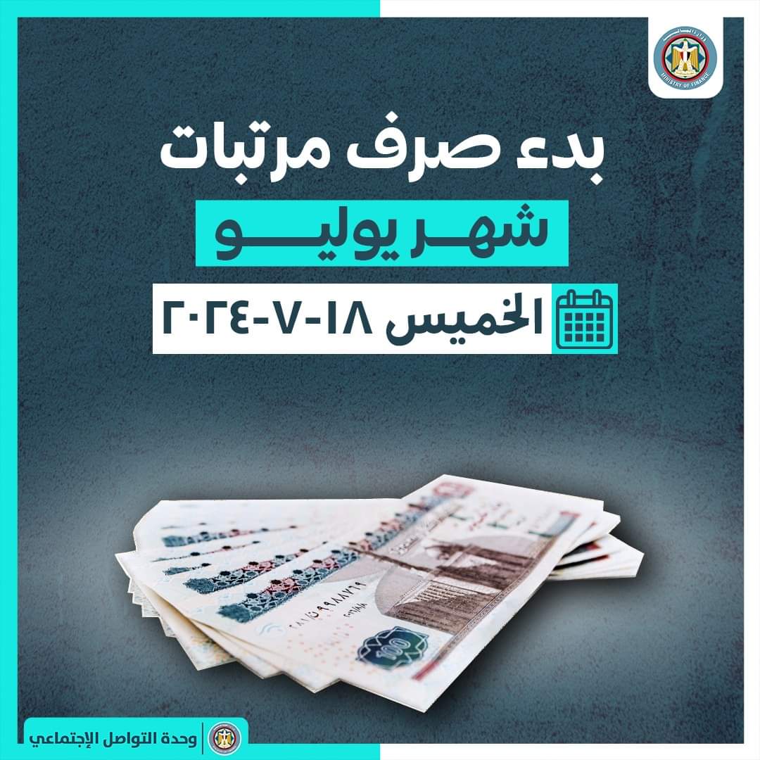 أكدت وزارة المالية عن بدء صرف مرتبات شهر يوليو 2024 للعاملين بالدولة بدءا من اليوم الخميس 18 يوليو 2024 حتى يوم 24 يوليو 2024. وأهابت وزارة المالية بالعاملين فى الجهات الإدارية عدم التزاحم على ماكينات الصراف الآلي، خاصة أن المرتبات ستكون متاحة فى أى وقت اعتبارًا من تاريخ بدء الصرف المحدد لكل الجهات الإدارية.
