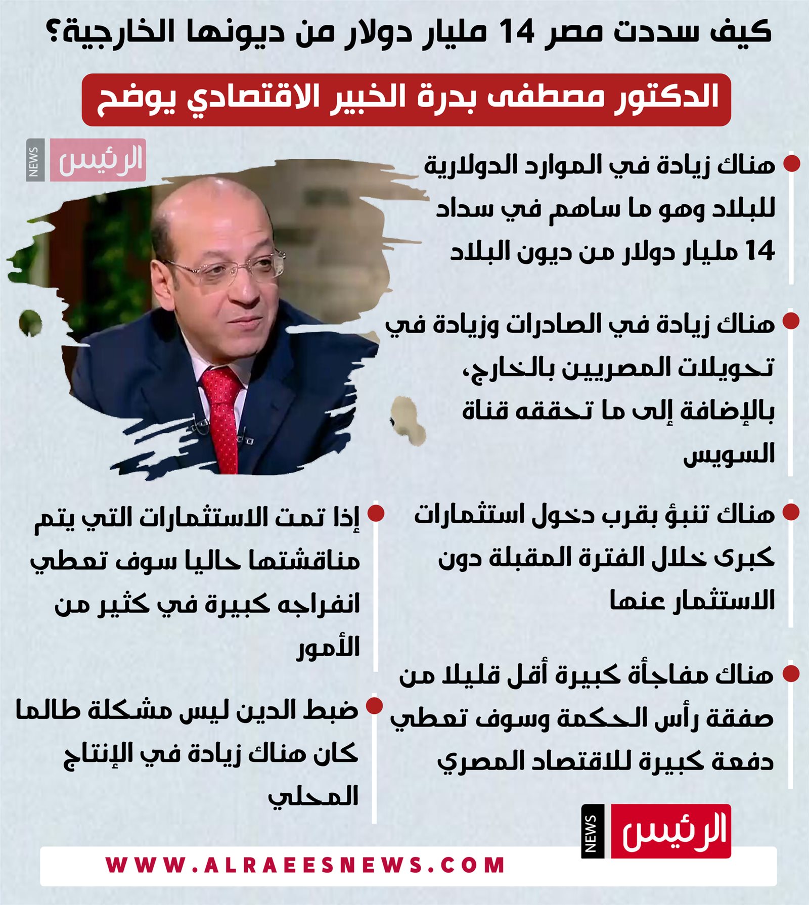 كشف الدكتور مصطفى بدرة، الخبير الاقتصادي، عن عدد من العوامل التي تمكنت مصر من خلالها أن تسدد 14 مليار دولار من ديونها الخارجية.