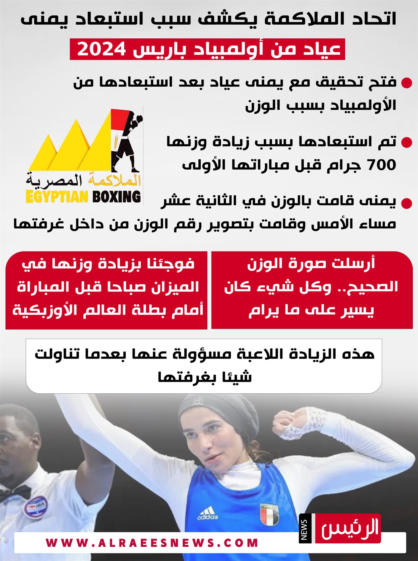 أعلن رئيس اتحاد الملاكمة، عبد العزيز غنيم، استبعاد الملاكمة المصرية يمنى عياد من أولمبياد باريس 2024.