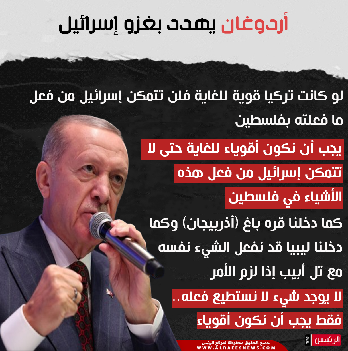 صعد الرئيس التركي رجب طيب أردوغان من حديثه ضد الاحتلال الإسرائيلي، وقال إن بلاده كما تدخلت في قره باغ وليبيا تستطيع فعل الشيء نفسه في إسرائيل، مؤكدا أن امتلاك القوة كفيل باتخاذ مثل هذه الخطوة على حد تعبيره.