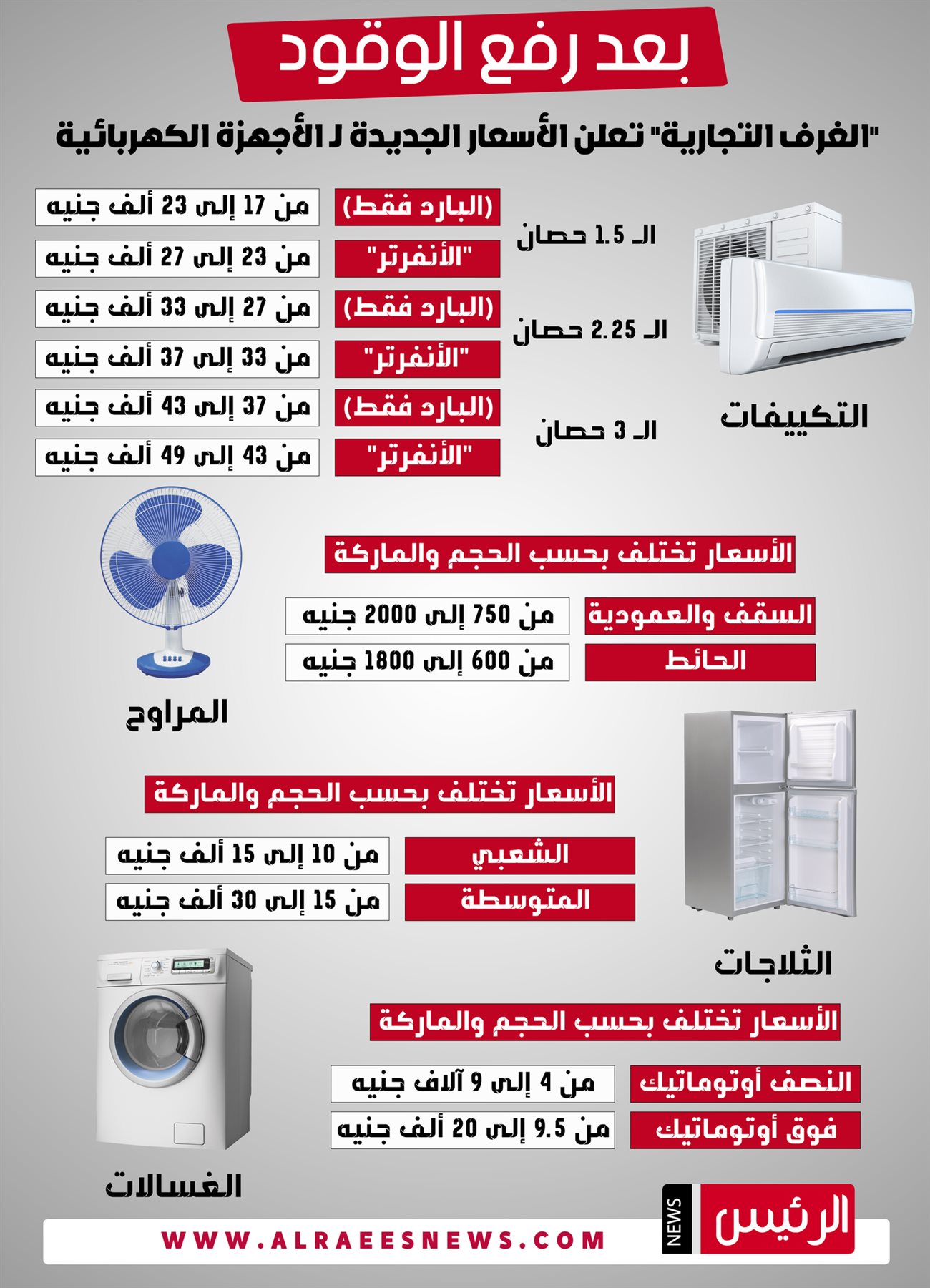 أعلنت شعبة الأجهزة الكهربائية بالغرفة التجارية، الأسعار الجديدة لعدد من الأجهزة الكهربائية، بعد الزيادة الأخيرة في أسعار الوقود.