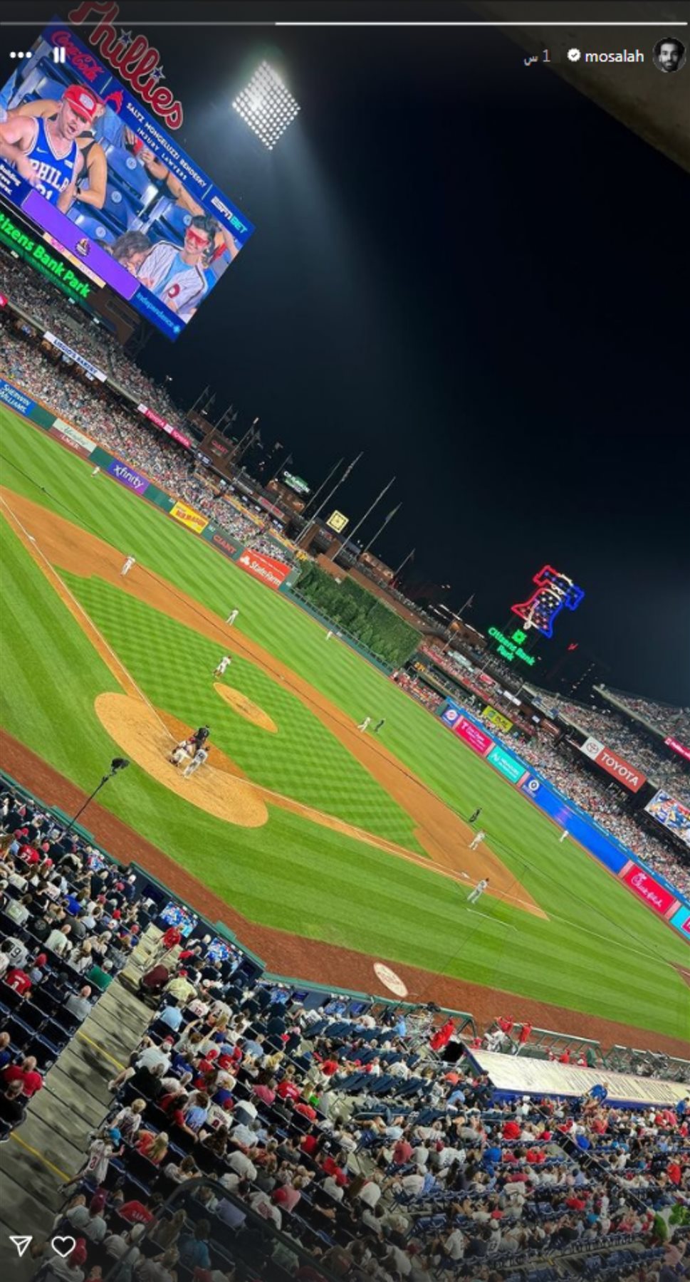 ونشر صلاح عبر حسابه على "إنستجرام" صورة من مدرجات ملعب "سيتيزنز بنك بارك" في فيلادلفيا الأمريكية، على هامش مباراة حضرها، جمعت فيلادلفيا فيليز ونيويورك يانكيز في دوري البيسبول الأمريكي (MLB) والتي حسمها يانكيز بنتيجة (14-4).