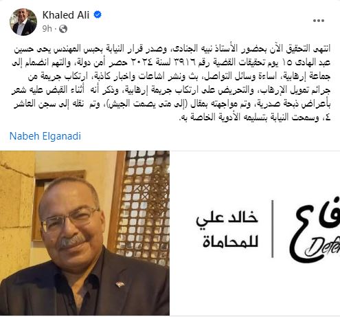 وأشار في منشوره التالي إلى أنه تم إبلاغه تليفونيا من نيابة أمن الدولة العليا بوجود المهندس يحى حسين عبد الهادى بمقرها لبدء التحقيق معه، وأنه طلب حضور مكتبى التحقيق للدفاع عنه، فأبلغتهم أن زميلى نبيه الجنادى منتظر أمام باب النيابة، فسُمح له بالدخول لحضور التحقيق.