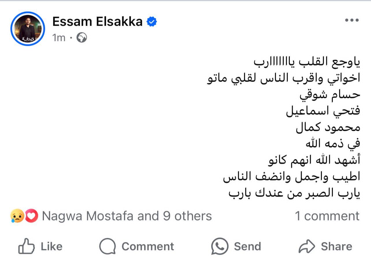 وكان الفنان عصام السقا قد أعلن وفاة الثلاثي عبر صفحته الشخصية على فيسبوك قائلا: “يا وجع القلب يا رب.. إخواتي وأقرب الناس لقلبي ماتوا.. حسام شوقي وفتحي اسماعيل ومحمود كمال في ذمة الله”.
