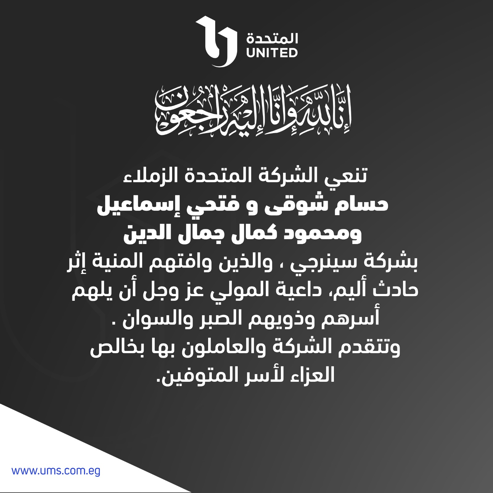 ونعت الشركة المتحدة للخدمات الإعلامية الزملاء حسام شوقى وفتحي إسماعيل ومحمود كمال جمال الدين بشركة سينرجي، والذين وافتهم المنية إثر حادث أليم، داعية المولي عز وجل أن يلهم أسرهم وذويهم الصبر والسوان، مقدمة خالص العزاء لأسر المتوفين.